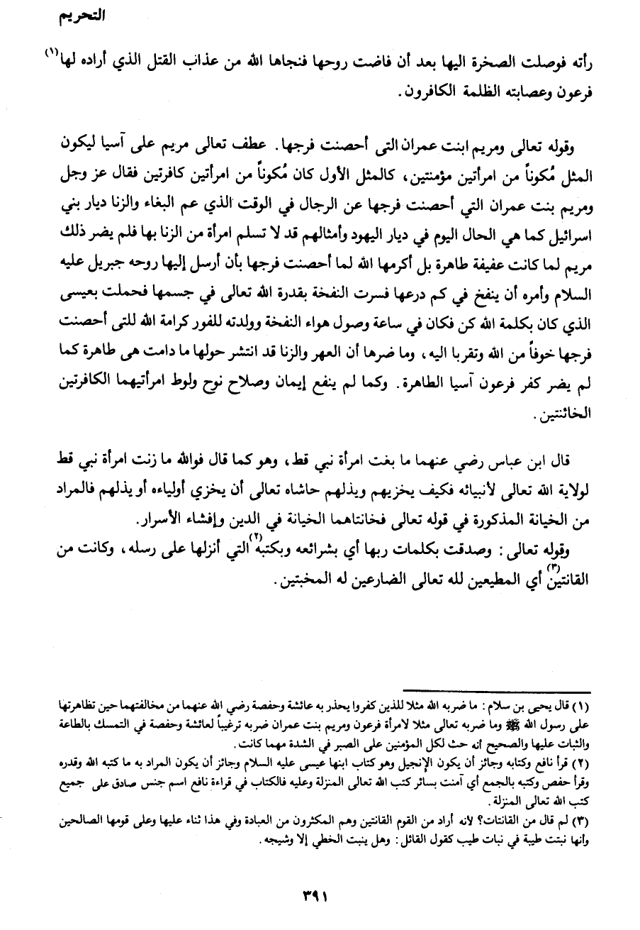 3 لم قال من القانتات؟ لأنه أراد من القوم القانتين وهم المكثرون من العبادة وفي هذا ثناء عليها وعلى قومها الصالحين وأنها نبتت طيبة في نبات طيب كقول القائل: وهل ينبت الخطي إلا وشيجه.