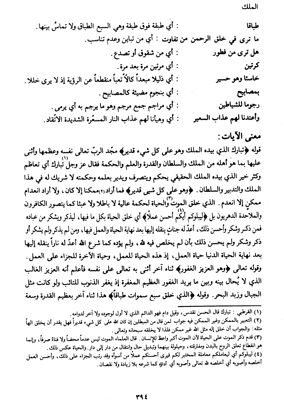 3 قدم ذكر الموت على الحياة لأن الموت أكبر واعظ للإنسان. قال العلماء الموت ليس عدماً محضاً ولا فناءً صرفاً، وإنما هو انقطاع تعلق الروح بالبدن ومفارقته، وحيلولة بينهما وتبديل حال وانتقال من دار إلى دار. والحياة عكس ذلك.
