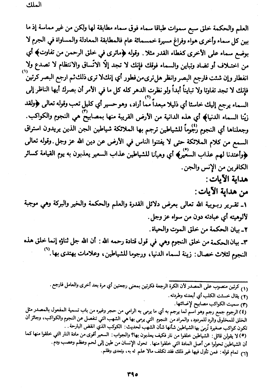 3- بيان الحكمة من خلق النجوم وهي في قول قتادة رحمه الله: أن الله جل ثناؤه إنما خلق هذه النجوم لثلاث خصال: زينة لسماء الدنيا، ورجوما للشياطين، وعلامات يهتدى بها.6