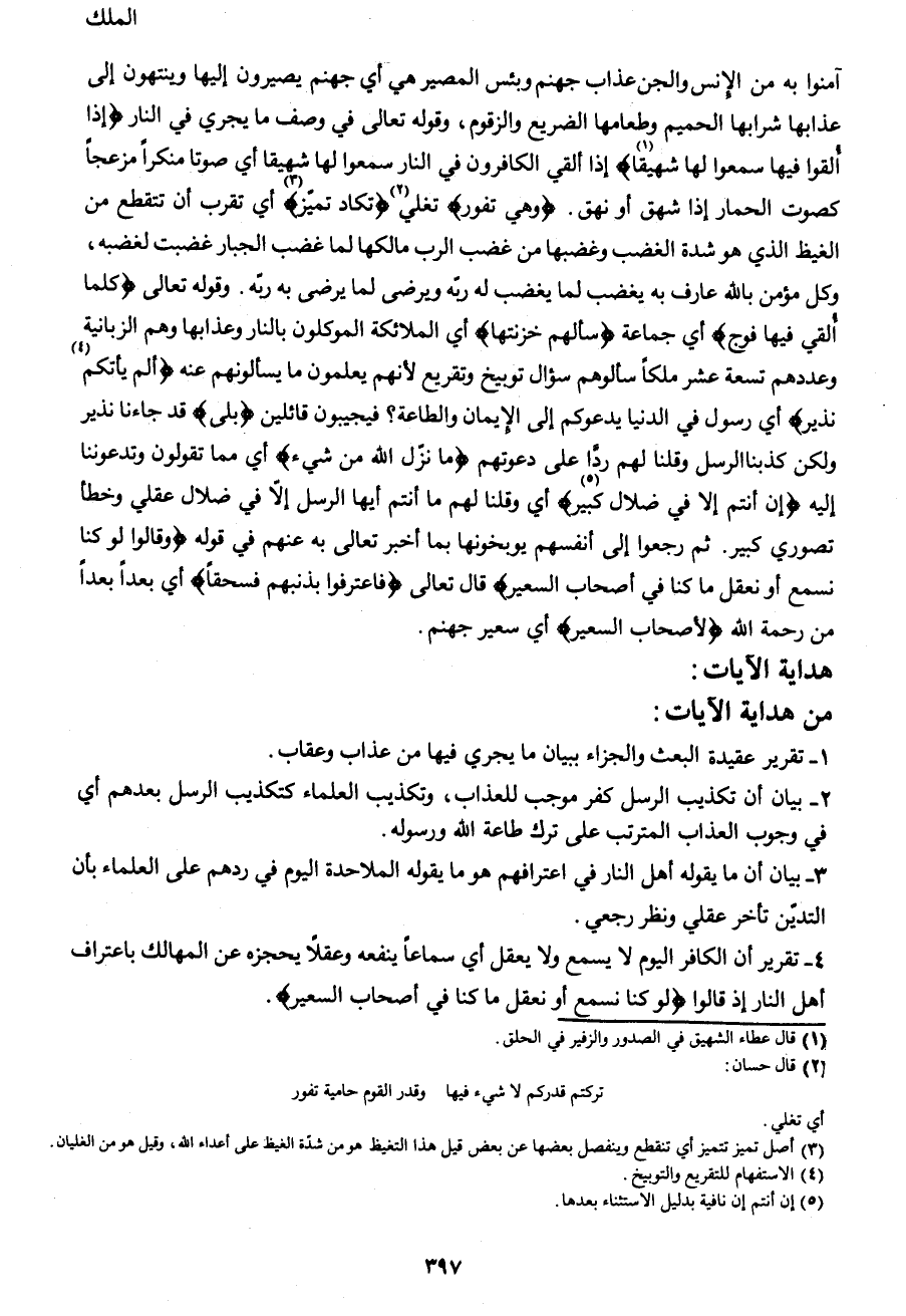 {كُلَّمَا أُلْقِيَ فِيهَا فَوْجٌ} أي جماعة {سَأَلَهُمْ خَزَنَتُهَا} أي الملائكة الموكلون بالنار وعذابها وهم الزبانية وعددهم تسعة عشر ملكاً سألوهم سؤال توبيخ وتقريع لأنهم يعلمون ما يسألونهم عنه {أَلَمْ يَأْتِكُمْ4 نَذِيرٌ} أي رسول في الدنيا يدعوكم إلى الإيمان والطاعة؟ فيجيبون قائلين {بَلَى} قد جاءنا نذير ولكن كذبنا الرسل وقلنا لهم رداً على دعوتهم {مَا نَزَّلَ اللهُ مِنْ شَيْءٍ} أي مما تقولون وتدعوننا إليه {إِنْ أَنْتُمْ إِلَّا فِي ضَلالٍ كَبِيرٍ5} أي وقلنا لهم ما أنتم أيها الرسل إلا في ضلال عقلي وخطأ تصوري كبير. ثم رجعوا إلى أنفسهم يوبخونها بما أخبر تعالى به عنهم في قوله {وَقَالُوا لَوْ كُنَّا نَسْمَعُ أَوْ نَعْقِلُ مَا كُنَّا فِي أَصْحَابِ السَّعِيرِ} قال تعالى {فَاعْتَرَفُوا بِذَنْبِهِمْ فَسُحْقاً} أي بعداً بعداً من رحمة الله {لِأَصْحَابِ السَّعِيرِ} أي سعير جهنم.