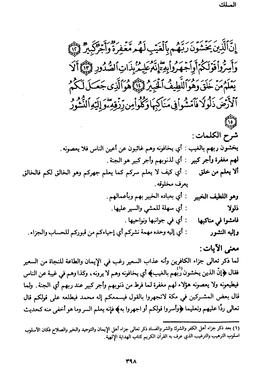إِنَّ الَّذِينَ يَخْشَوْنَ رَبَّهُمْ بِالْغَيْبِ لَهُمْ مَغْفِرَةٌ وَأَجْرٌ كَبِيرٌ (12) وَأَسِرُّوا قَوْلَكُمْ أَوِ اجْهَرُوا بِهِ إِنَّهُ عَلِيمٌ بِذَاتِ الصُّدُورِ (13) ألا يَعْلَمُ مَنْ خَلَقَ وَهُوَ اللَّطِيفُ الْخَبِيرُ (14) هُوَ الَّذِي جَعَلَ لَكُمُ الْأَرْضَ ذَلُولاً فَامْشُوا فِي مَنَاكِبِهَا وَكُلُوا مِنْ رِزْقِهِ وَإِلَيْهِ النُّشُورُ (15)