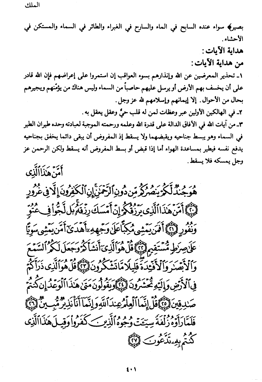 أَمَّنْ هَذَا الَّذِي هُوَ جُنْدٌ لَكُمْ يَنْصُرُكُمْ مِنْ دُونِ الرَّحْمَنِ إِنِ الْكَافِرُونَ إِلَّا فِي غُرُورٍ (20) أَمَّنْ هَذَا الَّذِي يَرْزُقُكُمْ إِنْ أَمْسَكَ رِزْقَهُ بَلْ لَجُّوا فِي عُتُوٍّ وَنُفُورٍ (21) أَفَمَنْ يَمْشِي مُكِبّاً عَلَى وَجْهِهِ أَهْدَى أَمَّنْ يَمْشِي سَوِيّاً عَلَى صِرَاطٍ مُسْتَقِيمٍ (22) قُلْ هُوَ الَّذِي أَنْشَأَكُمْ وَجَعَلَ لَكُمُ السَّمْعَ وَالْأَبْصَارَ وَالْأَفْئِدَةَ قَلِيلاً مَا تَشْكُرُونَ (23) قُلْ هُوَ الَّذِي ذَرَأَكُمْ فِي الْأَرْضِ وَإِلَيْهِ تُحْشَرُونَ (24) وَيَقُولُونَ مَتَى هَذَا الْوَعْدُ إِنْ كُنْتُمْ صَادِقِينَ (25) قُلْ إِنَّمَا الْعِلْمُ عِنْدَ اللهِ وَإِنَّمَا أَنَا نَذِيرٌ مُبِينٌ (26) فَلَمَّا رَأَوْهُ زُلْفَةً سِيئَتْ وُجُوهُ الَّذِينَ كَفَرُوا وَقِيلَ هَذَا الَّذِي كُنْتُمْ بِهِ تَدَّعُونَ (27)