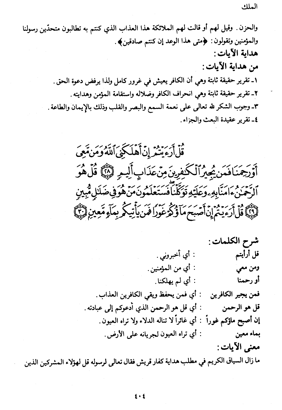 قُلْ أَرَأَيْتُمْ إِنْ أَهْلَكَنِيَ اللهُ وَمَنْ مَعِيَ أَوْ رَحِمَنَا فَمَنْ يُجِيرُ الْكَافِرِينَ مِنْ عَذَابٍ أَلِيمٍ (28) قُلْ هُوَ الرَّحْمَنُ آمَنَّا بِهِ وَعَلَيْهِ تَوَكَّلْنَا فَسَتَعْلَمُونَ مَنْ هُوَ فِي ضَلالٍ مُبِينٍ (29) قُلْ أَرَأَيْتُمْ إِنْ أَصْبَحَ مَاؤُكُمْ غَوْراً فَمَنْ يَأْتِيكُمْ بِمَاءٍ مَعِينٍ (30)