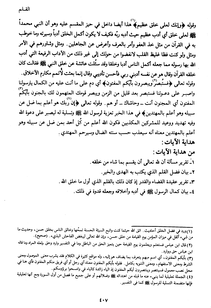 وقوله {وَإِنَّكَ لَعَلَى خُلُقٍ عَظِيمٍ} 1 هذا أيضا داخل في حيز المقسم عليه وهو أن النبي محمداً صَلَّى اللهُ عَلَيْهِ وَسَلَّمَ لعلى خلق أي أدب عظيم حيث أدبه ربه فكيف لا يكون أكمل الخلق أدباً وسيرته وما خوطب به في القرآن من مثل خذ العفو وأمر بالمعروف وأعرض عن الجاهلين. ومثل وشاورهم في الأمر ومثل ولو كنت فظا غليظ القلب لانفضوا من حولك إلى غير ذلك من الآداب الرفيعة التي أدب الله بها رسوله مما جعله أكمل الناس أدبا وخلقا وقد سئلت عائشة عن خلق النبي صَلَّى اللهُ عَلَيْهِ وَسَلَّمَ فقالت كان خلقه القرآن وقال هو عن نفسه أدبني ربي فأحسن تأديبي وقال إنما بعثت لأتمم مكارم الأخلاق. وقوله تعالى {فَسَتُبْصِرُ2 وَيُبْصِرُونَ بِأَيِّكُمُ الْمَفْتُونُ} أي دم على ما أنت عليه من الكمال يا رسولنا واصبر على دعوتنا فستبصر بعد قليل من الزمن ويبصر قومك المتهمون لك بالجنون بأيكم3 المفتون أي المجنون أنت –وحاشاك- أو هم. وقوله تعالى {إِنَّ4 رَبَّكَ هُوَ أَعْلَمُ بِمَنْ ضَلَّ عَنْ سَبِيلِهِ وَهُوَ أَعْلَمُ بِالْمُهْتَدِينَ} في هذا الخبر تعزية لرسول الله صَلَّى اللهُ عَلَيْهِ وَسَلَّمَ وتسلية له ليصبر على دعوة الله وفيه تهديد ووعيد للمشركين المكذبين فكون الله أعلم من كل أحد بمن ضل عن سبيله وهو أعلم بالمهتدين معناه أنه سيعذب حسب سنته الضال وسيرحم المهتدي.