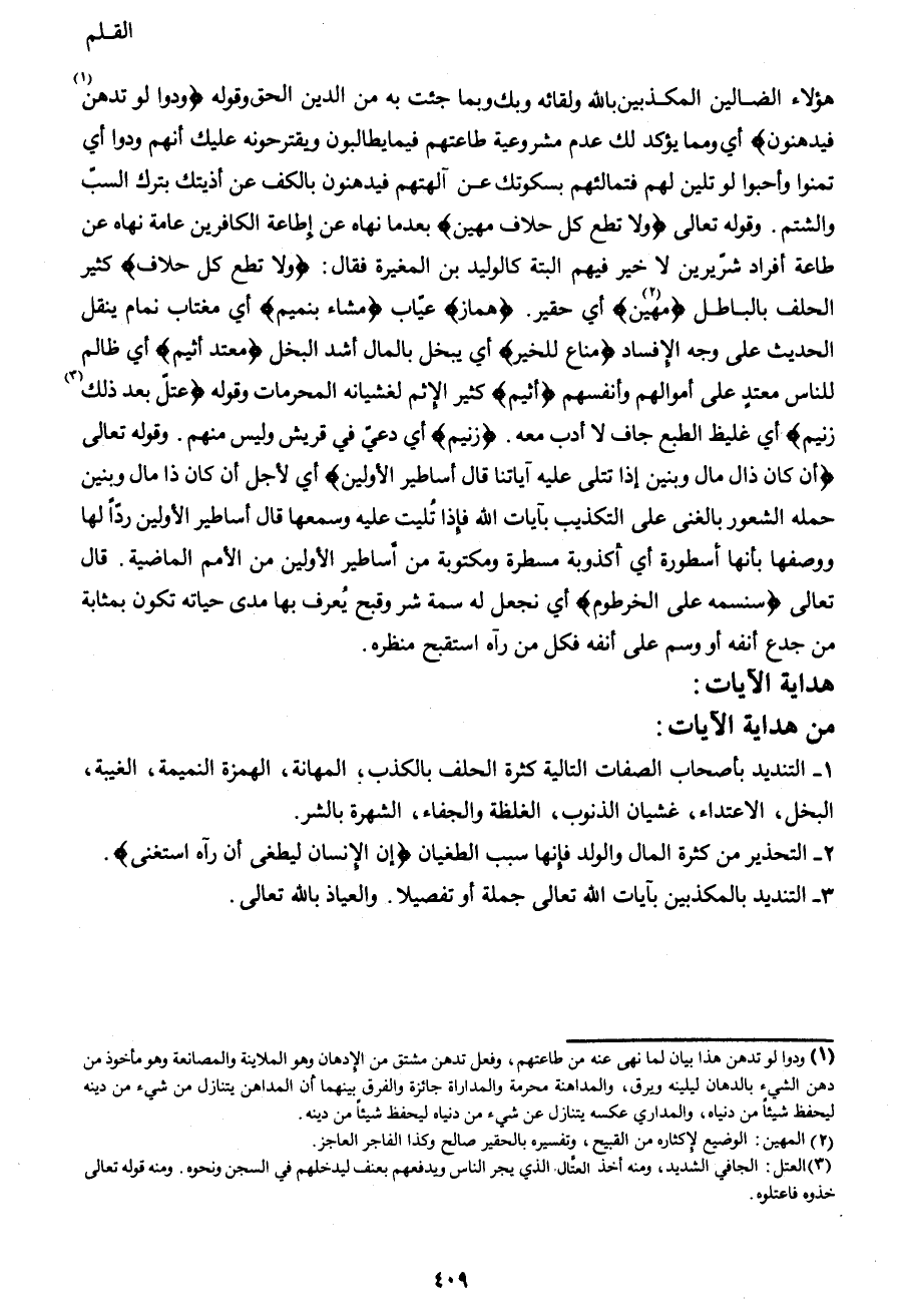 هؤلاء الضالين المكذبين بالله ولقائه وبك وبما جئت به من الدين الحق وقوله {وَدُّوا لَوْ تُدْهِنُ1 فَيُدْهِنُونَ} أي ومما يؤكد لك عدم مشروعية طاعتهم فيما يطالبون ويقترحونه عليك أنهم ودوا أي تمنوا وأحبوا لو تلين لهم فتمالئهم بسكوتك عن آلهتهم فيدهنون بالكف عن أذيتك بترك السب والشتم. وقوله تعالى {وَلا تُطِعْ كُلَّ حَلَّافٍ مَهِينٍ} بعدما نهاه عن إطاعة الكافرين عامة نهاه عن طاعة أفراد شريرين لا خير فيهم البتة كالوليد بن المغيرة فقال: {وَلا تُطِعْ كُلَّ حَلَّافٍ} كثير الحلف بالباطل {مَهِين2ٍ} أي حقير. {هَمَّازٍ} عياب {مَشَّاءٍ بِنَمِيمٍ} أي مغتاب نمام ينقل الحديث على وجه الإفساد {مَنَّاعٍ لِلْخَيْرِ} أي يبخل بالمال أشد البخل {مُعْتَدٍ أَثِيمٍ} أي ظالم للناس معتد على أموالهم وأنفسهم {أَثِيمٍ} كثير الإثم لغشيانه المحرمات وقوله {عُتُلٍّ بَعْدَ ذَلِكَ3 زَنِيمٍ} أي غليظ الطبع جاف لا أدب معه. {زَنِيمٍ} أي دعي في قريش وليس منهم. وقوله تعالى {أَنْ كَانَ ذَا مَالٍ وَبَنِينَ إِذَا تُتْلَى عَلَيْهِ آيَاتُنَا قَالَ أَسَاطِيرُ الْأَوَّلِينَ} أي لأجل أن كان ذا مال وبنين حمله الشعور بالغنى على التكذيب بآيات الله فإذا تليت عليه وسمعها قال أساطير الأولين رداً لها ووصفوها بأنها أسطورة أي أكذوبة مسطرة ومكتوبة من أساطير الأولين من الأمم الماضية. قال تعالى {سَنَسِمُهُ عَلَى الْخُرْطُومِ} أي نجعل له سمة شر وقبح يعرف بها مدى حياته تكون بمثابة من جدع أنفه أو وسم على أنفه فكل من رآه استقبح منظره.
