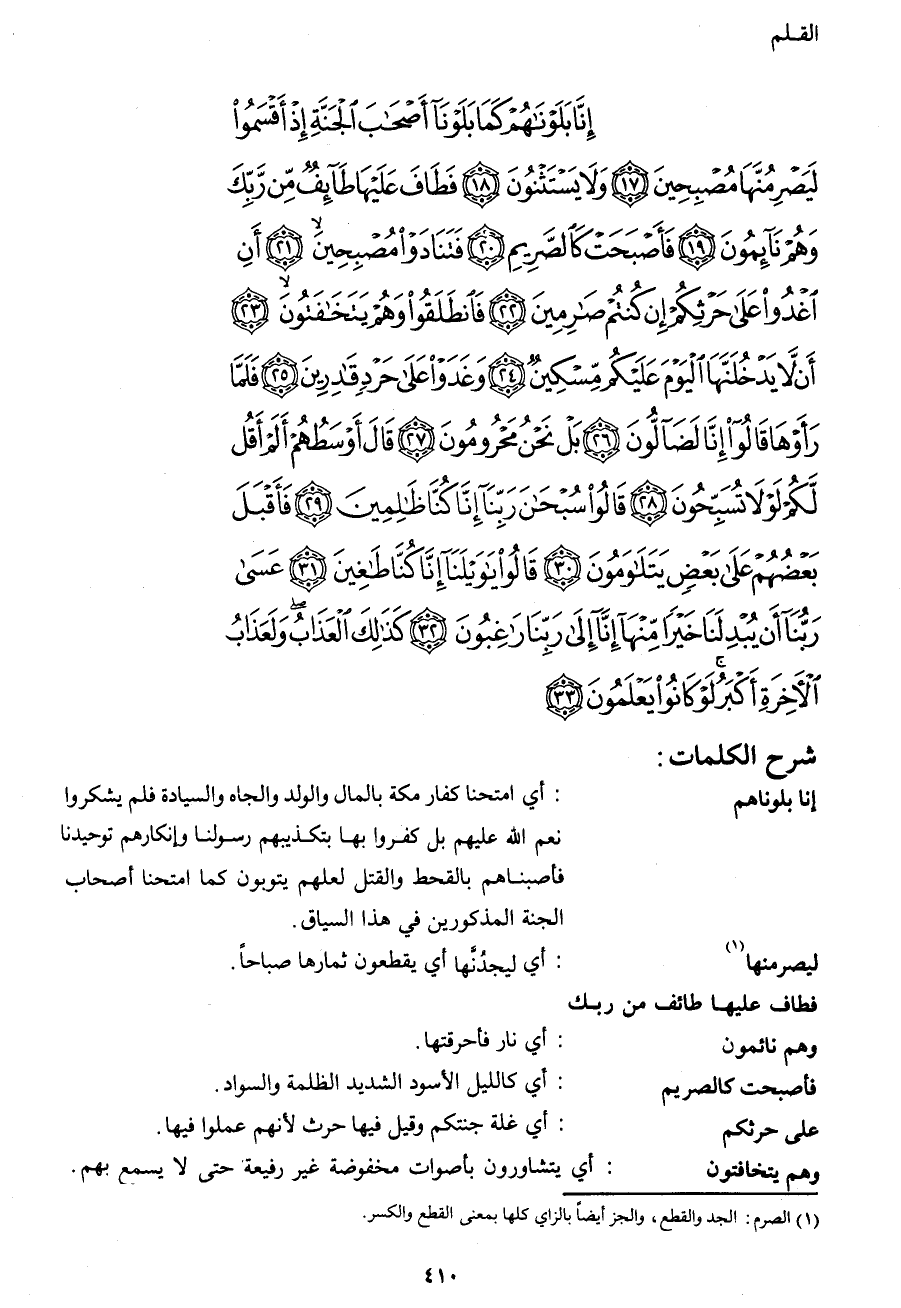 إِنَّا بَلَوْنَاهُمْ كَمَا بَلَوْنَا أَصْحَابَ الْجَنَّةِ إِذْ أَقْسَمُوا لَيَصْرِمُنَّهَا مُصْبِحِينَ (17) وَلا يَسْتَثْنُونَ (18) فَطَافَ عَلَيْهَا طَائِفٌ مِنْ رَبِّكَ وَهُمْ نَائِمُونَ (19) فَأَصْبَحَتْ كَالصَّرِيمِ (20) فَتَنَادَوْا مُصْبِحِينَ (21) أَنِ اغْدُوا عَلَى حَرْثِكُمْ إِنْ كُنْتُمْ صَارِمِينَ (22) فَانْطَلَقُوا وَهُمْ يَتَخَافَتُونَ (23) أَنْ لا يَدْخُلَنَّهَا الْيَوْمَ عَلَيْكُمْ مِسْكِينٌ (24) وَغَدَوْا عَلَى حَرْدٍ قَادِرِينَ (25) فَلَمَّا رَأَوْهَا قَالُوا إِنَّا لَضَالُّونَ (26) بَلْ نَحْنُ مَحْرُومُونَ (27) قَالَ أَوْسَطُهُمْ أَلَمْ أَقُلْ لَكُمْ لَوْلا تُسَبِّحُونَ (28) قَالُوا سُبْحَانَ رَبِّنَا إِنَّا كُنَّا ظَالِمِينَ (29) فَأَقْبَلَ بَعْضُهُمْ عَلَى بَعْضٍ يَتَلاوَمُونَ (30) قَالُوا يَا وَيْلَنَا إِنَّا كُنَّا طَاغِينَ (31) عَسَى رَبُّنَا أَنْ يُبْدِلَنَا خَيْراً مِنْهَا إِنَّا إِلَى رَبِّنَا رَاغِبُونَ (32) كَذَلِكَ الْعَذَابُ وَلَعَذَابُ الْآخِرَةِ أَكْبَرُ لَوْ كَانُوا يَعْلَمُونَ (33)