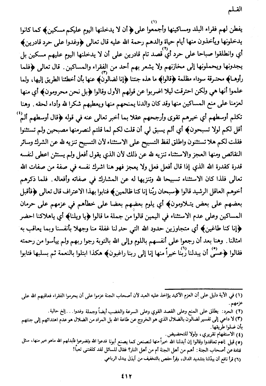 يفطن لهم فقراء البلد ومساكينها وأجمعوا1 على {أَنْ لا يَدْخُلَنَّهَا الْيَوْمَ عَلَيْكُمْ مِسْكِينٌ} كما كانوا يدخلونها ويأخذون منها أيام حياة والدهم رحمه الله عليه قال تعالى {وَغَدَوْا عَلَى حَرْدٍ قَادِرِينَ} أي وانطلقوا صباحا على حرد أي2 قصد تام قادرين على أن لا يدخلنها اليوم عليهم مسكين بل يجدونها ويحملونها إلى مخازنهم ولا يشعر بهم أحد من الفقراء والمساكين. قال تعالى {فَلَمَّا رَأَوْهَا} محترقة سوداء مظلمة {قَالُوا} ما هذه جنتنا {إِنَّا لَضَالُّونَ3} عنها بأن أخطئنا الطريق إليها، ولما علموا أنها هي ولكن احترقت ليلا اضربوا عن قولهم الأول وقالوا {بَلْ نَحْنُ مَحْرُومُونَ} أي منها لعزمنا على منع المساكين منها وقد كان والدنا يمنحهم منها ويعطيهم شكرا لله وأداء لحقه. وهنا تكلم أوسطهم أي خيرهم تقوى وأرجحهم عقلا بما أخبر تعالى عنه في قوله {قَالَ أَوْسَطُهُمْ أَلَمْ4 أَقُلْ لَكُمْ لَوْلا تُسَبِّحُونَ} أي ألم يسبق لي أن قلت لكم لما قلتم لنصرمنها مصبحين ولم يستثنوا فقلت لكم هلا يستثنون وأطلق لفظ التسبيح على الاستثناء لأن التسبيح تنزيه لله عن الشرك وسائر النقائص ومنها العجز والاستثناء تنزيه لله عن ذلك لأن الذي يقول أفعل ولم يستثن أعطى لنفسه قدرة كقدرة الله الذي إذا قال أفعل فعل ولا يعجز فهو هنا أشرك نفسه في صفة من صفات الله تعالى فلذا كان الاستثناء تسبيحا لله وتنزيها له عن المشارك في صفاته وأفعاله. فلما ذكرهم أخوهم العاقل الرشيد قالوا {سُبْحَانَ رَبِّنَا إِنَّا كُنَّا ظَالِمِينَ} فنابوا بهذا الاعتراف قال تعالى {فَأَقْبَلَ بَعْضُهُمْ عَلَى بَعْضٍ يَتَلاوَمُونَ} أي يلوم بعضهم بعضا على خطأهم في عزمهم على حرمان المساكين وعلى عدم الاستثناء في اليمين قالوا من جملة ما قالوا {قَالُوا يَا وَيْلَنَا} أي يا هلاكنا احضر {إِنَّا كُنَّا طَاغِينَ} أي متجاوزين حدود الله التي حد لنا غفلة منا وجهلا بأنفسنا وبما يعاقب به أمثالنا. وهنا بعد أن رجعوا على أنفسهم باللوم وإلى الله بالتوبة رجوا ربهم ولم ييأسوا من رحمته فقالوا {عَسَى5 رَبُّنَا أَنْ يُبْدِلَنَا خَيْراً مِنْهَا إِنَّا إِلَى رَبِّنَا6 رَاغِبُونَ} هكذا ابتلوا بالنعمة ثم بسلبها فتابوا