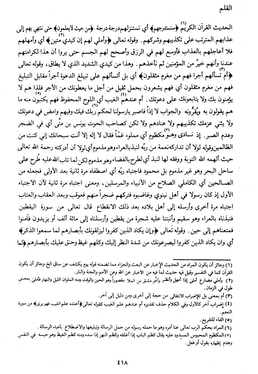 الحديث القرآن الكريم1 {سَنَسْتَدْرِجُهُمْ} أي نستنزلهم درجة درجة {مِنْ حَيْثُ لا يَعْلَمُونَ} حتى ننتهي بهم إلى عذابهم المترتب على تكذيبهم وشركهم. وقوله تعالى {وَأُمْلِي لَهُمْ إِنَّ كَيْدِي2 مَتِينٌ} أي وأمهلهم فلا أعاجلهم بالعذاب فأوسع لهم في الرزق وأصحح لهم الجسم حتى يروا أن هذا لكرامتهم عندنا وأنهم خير من المؤمنين ثم نأخذهم. وهذا من كيدي الشديد الذي لا يطاق، وقوله تعالى {أَمْ3 تَسْأَلُهُمْ أَجْراً فَهُمْ مِنْ مَغْرَمٍ مُثْقَلُونَ} أي بل أتسألهم على تبليغ الدعوة أجراً مقابل التبليغ فهم من مغرم مثقلون أي فهم يشعرون بحمل ثقيل من أجل ما يعطونك من الأجر فلذا هم لا يؤمنون بك ولا يتابعونك على دعوتك. أم عندهم4 الغيب أي اللوح المحفوظ فهم يكتبون5 منه ما هم يقولون به ويقرونه والجواب لا إذاً فأصبر يا رسولنا لحكم 6 ربك فيك وفيهم وامض في دعوتك ولا يثني عزمك تكذيبهم ولا عنادهم ولا تكن كصاحب الحوت يونس بن متّى أي في الضجر وعدم الصبر. إذ نادى وهو7 مكظوم أي مملوء غماً فقال لا إله إلا أنت سبحانك إني كنت من الظالمين وقوله لولا أن تداركه نعمة من ربه لنبذ بالعراء وهو مذموم أي لولا أن أدركته رحمة الله تعالى حيث ألهمه الله التوبة ووفقه لها لنبذ أي لطرح بالفضاء وهو مذموم لكن لما تاب الله عليه طرح على ساحل البحر وهو غير مذموم بل محمود فاجتباه ربه أي اصطفاه مرة ثانية بعد الأولى فجعله من الصالحين أي الكاملي الصلاح من الأنبياء والمرسلين، ومعنى اجتباه مرة ثانية لأن الاجتباء الأول إذ كان رسولا في أهل نينوي وغاضبوه فتركهم ضجراً منهم فعوقب وبعد العقاب والعتاب اجتباه مرة أخرى وأرسله إلى أهل بلاده بعد ذلك الانقطاع قال تعالى من سورة اليقطين فنبذناه بالعراء وهو سقيم وأنبتنا عليه شجرة من يقطين وأرسلناه إلى مائة ألف أو يزيدون فآمنوا فمتعناهم إلى حين. وقوله تعالى {وَإِنْ يَكَادُ الَّذِينَ كَفَرُوا لَيُزْلِقُونَكَ بِأَبْصَارِهِمْ لَمَّا سَمِعُوا الذِّكْرَ} أي وإن يكاد الذين كفروا ليصرعونك من شدة النظر إليك وكلهم غيظ وحنق عليك بأبصارهم {لَمَّا