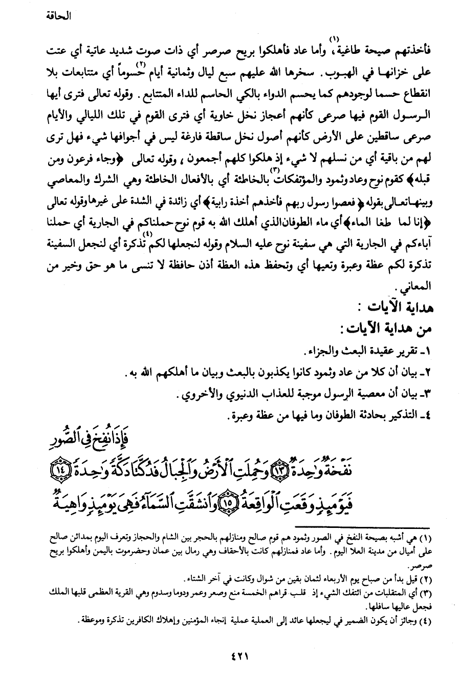 1 هي أشبه بصيحة النفخ في الصور وثمود هم قوم صالح ومنازلهم بالحجر بين الشام والحجاز وتعرف اليوم بمدائن صالح على أميال من مدينة العلا اليوم. وأما عاد فمنازلهم كانت بالأحقاف وهي رمال بين عمان وحضرموت باليمن وأهلكوا بريح صرصر.
