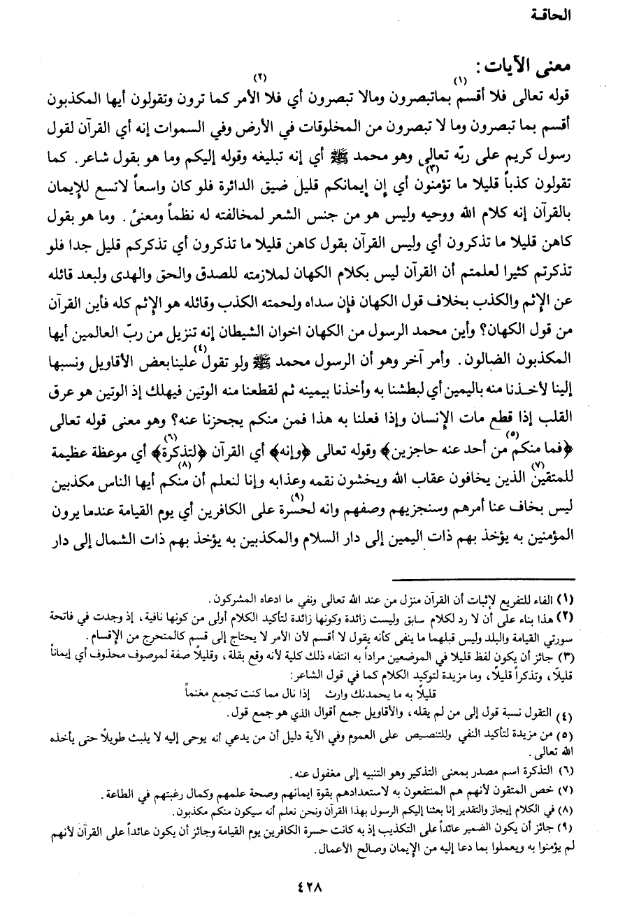 قوله تعالى فلا أقسم1 بما تبصرون وما لا تبصرون أي فلا2 الأمر كما ترون وتقولون أيها المكذبون أقسم بما تبصرون وما لا تبصرون من المخلوقات في الأرض وفي السماوات إنه أي القرآن لقول رسول كريم على ربه تعالى وهو محمد صَلَّى اللهُ عَلَيْهِ وَسَلَّمَ أي إنه تبليغه وقوله إليكم وما هو بقول شاعر. كما تقولون كذباً قليلا ما تؤمنون3 أي أن إيمانكم قليل ضيق الدائرة فلو كان واسعاً لاتسع للإيمان بالقرآن إنه كلام الله ووحيه وليس هو من جنس الشعر لمخالفته له نظماً ومعنىً. وما هو بقول كاهن قليلا ما تذكرون أي وليس القرآن بقول كاهن قليلا ما تذكرون أي تذكركم قليل جدا فلو تذكرتم كثيرا لعلمتم أن القرآن ليس بكلام الكهان لملازمته للصدق والحق والهدى ولبعد قائله عن الإثم والكذب بخلاف قول الكهان فإن سداه ولحمته الكذب وقائله هو الإثم كله فأين القرآن من قول الكهان؟ وأين محمد الرسول من الكهان إخوان الشيطان إنه تنزيل من رب العالمين أيها المكذبون الضالون. وأمر آخر وهو أن الرسول محمد صَلَّى اللهُ عَلَيْهِ وَسَلَّمَ ولو تقول4 علينا بعض الأقاويل ونسبها إلينا لأخذنا منه باليمين أي لبطشنا به وأخذنا بيمينه ثم لقطعتا منه الوتين فيهلك إذ الوتين هو عرق القلب إذا قطع مات الإنسان وإذا فعلنا به هذا فمن منكم يحجزنا عنه؟ وهو معنى قوله تعالى {فَمَا مِنْكُمْ5 مِنْ أَحَدٍ عَنْهُ حَاجِزِينَ} وقوله تعالى {وَإِنَّهُ} أي القرآن {لَتَذْكِرَةٌ6} أي موعظة عظيمة للمتقين7 الذين يخافون عقاب الله ويخشون نقمه وعذابه وإنا لنعلم أن 8منكم أيها الناس مكذبين ليس بخاف عنا أمرهم وسنجزيهم وصفهم وإنه لحسرة9 على الكافرين أي يوم القيامة عندما يرون المؤمنين به يؤخذ بهم ذات اليمين إلى دار السلام والمكذبين به يؤخذ بهم ذات الشمال إلى دار