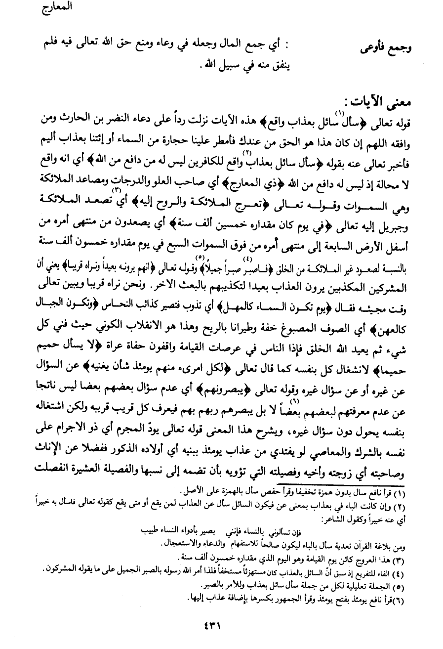 قوله تعالى {سَأَلَ1 سَائِلٌ بِعَذَابٍ وَاقِعٍ} هذه الآيات نزلت رداً على دعاء النضر بن الحارث ومن وافقه اللهم إن كان هذا هو الحق من عندك فأمطر علينا حجارة من السماء أو إئتنا بعذاب أليم فأخبر تعالى عنه بقوله {سَأَلَ سَائِلٌ بِعَذَابٍ2 وَاقِعٍ لِلْكَافِرِينَ لَيْسَ لَهُ دَافِعٌ مِنَ اللهِ} أي إنه واقع لا محالة إذ ليس له دافع من الله {ذِي الْمَعَارِجِ} أي صاحب العلو والدرجات ومصاعد الملائكة وهي السموات وقوله تعالى {تَعْرُجُ الْمَلائِكَةُ وَالرُّوحُ إِلَيْهِ} أي 3تصعد الملائكة وجبريا إليه تعالى {فِي يَوْمٍ كَانَ مِقْدَارُهُ خَمْسِينَ أَلْفَ سَنَةٍ} أي يصعدون من منتهى أمره من أسفل الأرض السابعة إلى منتهى أمره من فوق السموات السبع في يوم مقداره خمسون ألف سنة بالنسبة لصعود غير الملائكة من الخلق {فَاصْبِرْ4 صَبْراً جَمِيلاً5} وقوله تعالى {إِنَّهُمْ يَرَوْنَهُ بَعِيداً وَنَرَاهُ قَرِيباً} يعني أن المشركين المكذبين يرون العذاب بعيدا لتكذيبهم بالبعث الأخر. ونحن نراه قريبا ويبين تعالى وقت مجيئه فقال {يَوْمَ تَكُونُ السَّمَاءُ كَالْمُهْلِ} أي تذوب فتصير كذائب النحاس {وَتَكُونُ الْجِبَالُ كَالْعِهْنِ} أي الصوف المصبوغ خفة وطيرانا بالريح وهذا هو الانقلاب الكوني حيث فني كل شيء ثم يعيد الله الخلق فإذا الناس في عرصات القيامة واقفون حفاة عراة {لا يَسْأَلُ حَمِيمٌ حَمِيماً} لانشغال كل بنفسه كما قال تعالى {لِكُلِّ امْرِئٍ مِنْهُمْ يَوْمَئِذٍ شَأْنٌ يُغْنِيهِ} عن السؤال عن غيره أو عن سؤال غيره وقوله تعالى {يُبَصَّرُونَهُمْ} أي عدم سؤال بعضهم بعضا ليس ناتجا عن عدم معرفتهم لبعضهم بعضا6 لا بل يبصرهم ربهم بهم فيعرف كل قريب قريبه ولكن اشتغاله بنفسه يحول دون سؤال غيره، ويشرح هذا المعنى قوله تعالى يود المجرم أي ذو الإجرام على نفسه بالشرك والمعاصي لو يفتدي من عذاب يومئذ ببنيه أي أولاده الذكور ففضلا عن الإناث وصاحبته أي زوجته وأخيه وفصيلته التي تؤويه بأن تضمه إلى نسبها والفصيلة العشيرة انفصلت