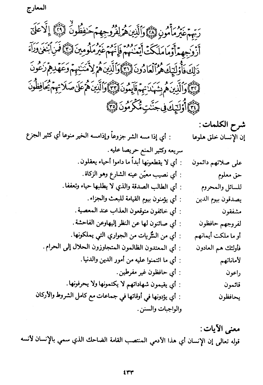رَبِّهِمْ غَيْرُ مَأْمُونٍ (28) وَالَّذِينَ هُمْ لِفُرُوجِهِمْ حَافِظُونَ (29) إِلَّا عَلَى أَزْوَاجِهِمْ أَوْ مَا مَلَكَتْ أَيْمَانُهُمْ فَإِنَّهُمْ غَيْرُ مَلُومِينَ (30) فَمَنِ ابْتَغَى وَرَاءَ ذَلِكَ فَأُولَئِكَ هُمُ الْعَادُونَ (31) وَالَّذِينَ هُمْ لِأَمَانَاتِهِمْ وَعَهْدِهِمْ رَاعُونَ (32) وَالَّذِينَ هُمْ بِشَهَادَاتِهِمْ قَائِمُونَ (33) وَالَّذِينَ هُمْ عَلَى صَلاتِهِمْ يُحَافِظُونَ (34) أُولَئِكَ فِي جَنَّاتٍ مُكْرَمُونَ (35)