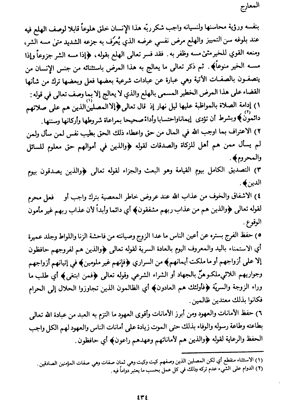 بنفسه ورؤية محاسنها ولنسيانه واجب شكر ربه هذا الإنسان خلق هلوعاً قابلا لوصف الهلع فيه عند بلوغه سن التمييز والهلع مرض نفسي عرضه الذي يعرف به جزعه الشديد متى مسه الشر، ومنعه القوي للخير متى مسه وظفر به. فقد فسر تعالى الهلع بقوله، {إِذَا مَسَّهُ الشَّرُّ جَزُوعاً وَإِذَا مَسَّهُ الْخَيْرُ مَنُوعاً} . ثم ذكر تعالى ما يعالج به هذا المرض باستثنائه من جنس الإنسان من يتصفون بالصفات الآتية وهي عبارة عن عبادات شرعية بعضها فعل وبعضها ترك من شأنها القضاء على هذا المرض الخطير المسمى بالهلع والذي لا يعالج إلا بما وصف تعالى في قوله: