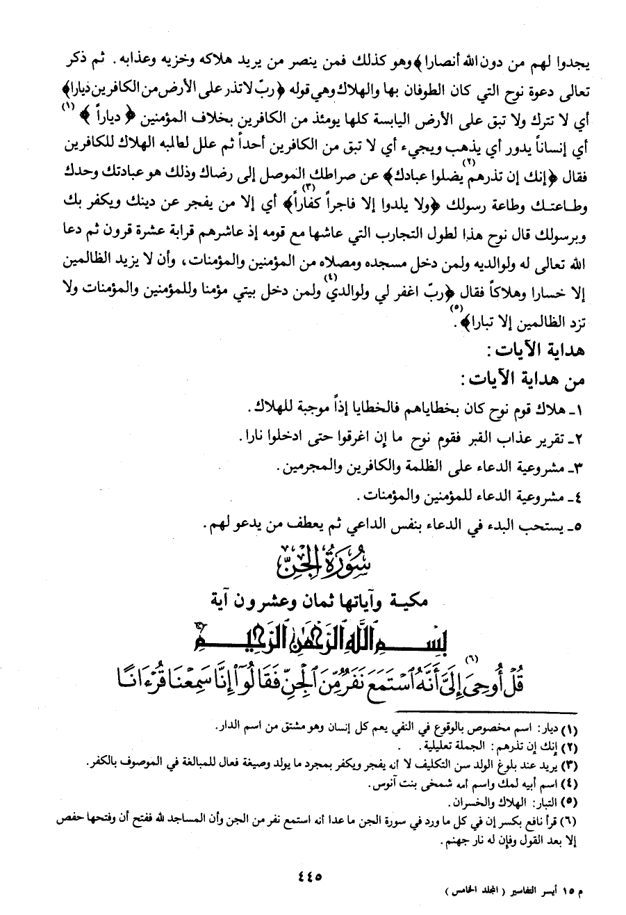 يَجِدُوا لَهُمْ مِنْ دُونِ اللهِ أَنْصَاراً} وهو كذلك فمن ينصر من يريد هلاكه وخزيه وعذابه. ثم ذكر تعالى دعوة نوح التي كان الطوفان بها والهلاك وهي قوله {وَقَالَ نُوحٌ رَبِّ لا تَذَرْ عَلَى الْأَرْضِ مِنَ الْكَافِرِينَ دَيَّاراً} أي لا تترك ولا تبق على الأرض اليابسة كلها يومئذ من الكافرين بخلاف المؤمنين {دَيَّاراً} 1 أي إنساناً يدور أي يذهب ويجيء أي لا تبق من الكافرين أحداً ثم علل لطلبه الهلاك للكافرين فقال {إِنَّكَ إِنْ تَذَرْهُمْ2 يُضِلُّوا عِبَادَكَ} عن صراطك الموصل إلى رضاك وذلك هو عبادتك وحدك وطاعتك وطاعة رسولك {وَلا يَلِدُوا إِلَّا فَاجِراً كَفَّارا3} أي إلا من يفجر عن دينك ويكفر بك وبرسولك قال نوح هذا لطول التجارب التي عاشها مع قومه إذ عاشرهم قرابة عشرة قرون ثم دعا الله تعالى له ولوالديه ولمن دخل مسجده ومصلاه من المؤمنين والمؤمنات، وأن لا يزيد الظالمين إلا خسارا وهلاكاً فقال {رَبِّ اغْفِرْ لِي وَلِوَالِدَيَّ4 وَلِمَنْ دَخَلَ بَيْتِيَ مُؤْمِناً وَلِلْمُؤْمِنِينَ وَالْمُؤْمِنَاتِ وَلا تَزِدِ الظَّالِمِينَ إِلَّا تَبَاراً} 5.