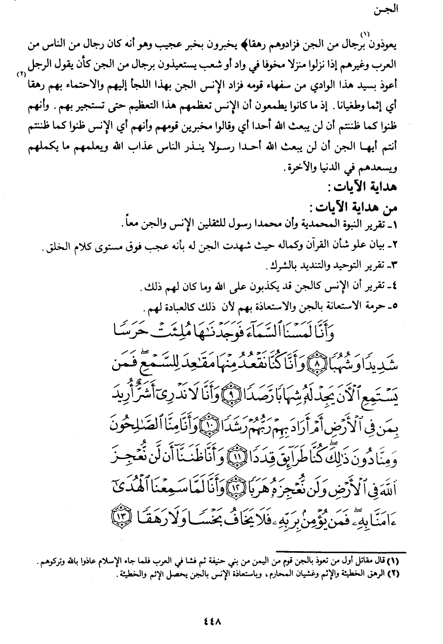 وَأَنَّا لَمَسْنَا السَّمَاءَ فَوَجَدْنَاهَا مُلِئَتْ حَرَساً شَدِيداً وَشُهُباً (8) وَأَنَّا كُنَّا نَقْعُدُ مِنْهَا مَقَاعِدَ لِلسَّمْعِ فَمَنْ يَسْتَمِعِ الْآنَ يَجِدْ لَهُ شِهَاباً رَصَداً (9) وَأَنَّا لا نَدْرِي أَشَرٌّ أُرِيدَ بِمَنْ فِي الْأَرْضِ أَمْ أَرَادَ بِهِمْ رَبُّهُمْ رَشَداً (10) وَأَنَّا مِنَّا الصَّالِحُونَ وَمِنَّا دُونَ ذَلِكَ كُنَّا طَرَائِقَ قِدَداً (11) وَأَنَّا ظَنَنَّا أَنْ لَنْ نُعْجِزَ اللهَ فِي الْأَرْضِ وَلَنْ نُعْجِزَهُ هَرَباً (12) وَأَنَّا لَمَّا سَمِعْنَا الْهُدَى آمَنَّا بِهِ فَمَنْ يُؤْمِنْ بِرَبِّهِ فَلا يَخَافُ بَخْساً وَلا رَهَقاً (13)