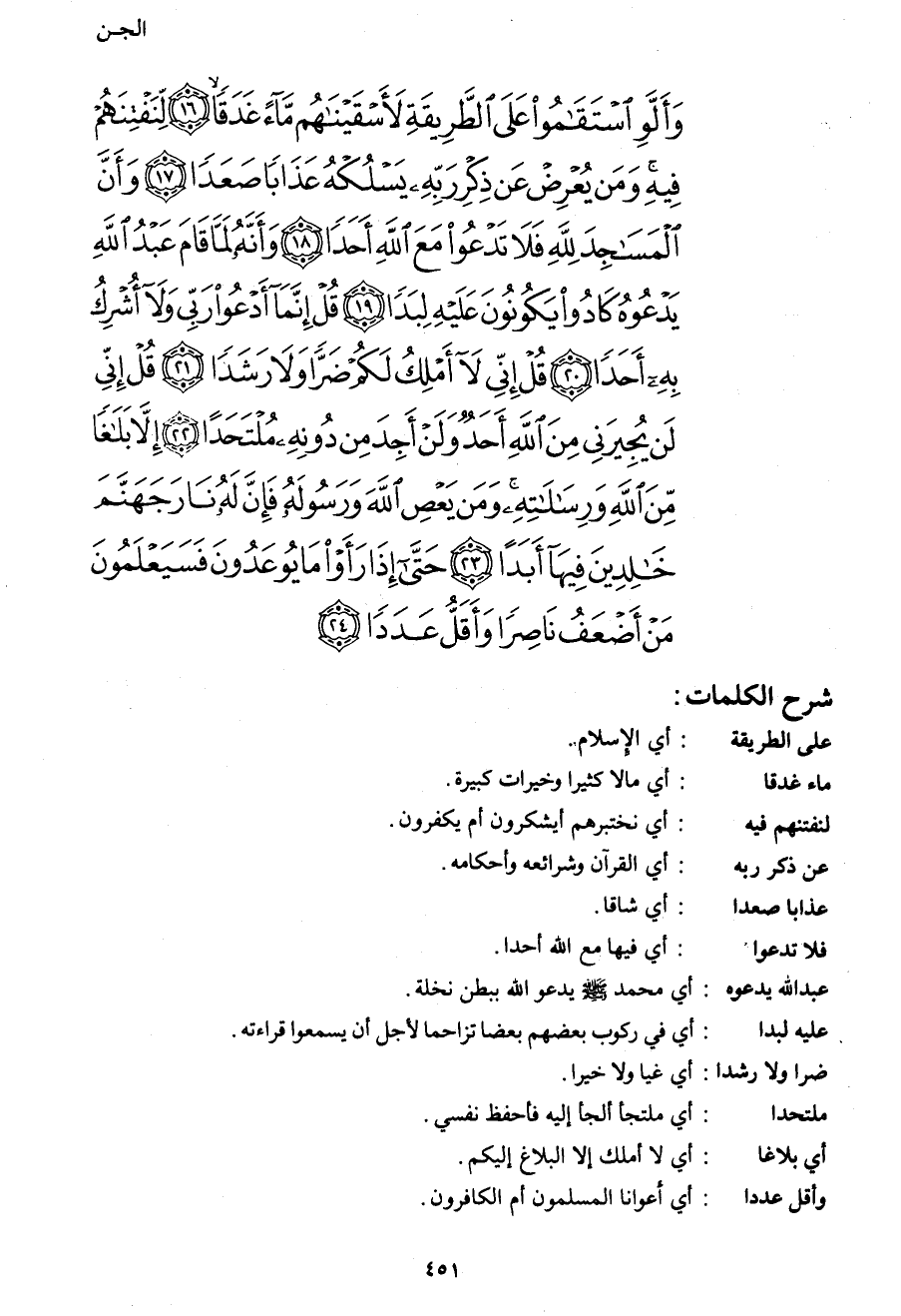 وَأَلَّوِ اسْتَقَامُوا عَلَى الطَّرِيقَةِ لَأَسْقَيْنَاهُمْ مَاءً غَدَقاً (16) لِنَفْتِنَهُمْ فِيهِ وَمَنْ يُعْرِضْ عَنْ ذِكْرِ رَبِّهِ يَسْلُكْهُ عَذَاباً صَعَداً (17) وَأَنَّ الْمَسَاجِدَ لِلَّهِ فَلا تَدْعُو مَعَ اللهِ أَحَداً (18) وَأَنَّهُ لَمَّا قَامَ عَبْدُ اللهِ يَدْعُوهُ كَادُوا يَكُونُونَ عَلَيْهِ لِبَداً (19) قُلْ إِنَّمَا أَدْعُو رَبِّي وَلا أُشْرِكُ بِهِ أَحَداً (20) قُلْ إِنِّي لا أَمْلِكُ لَكُمْ ضَرّاً وَلا رَشَداً (21) قُلْ إِنِّي لَنْ يُجِيرَنِي مِنَ اللهِ أَحَدٌ وَلَنْ أَجِدَ مِنْ دُونِهِ مُلْتَحَداً (22) إِلَّا بَلاغاً مِنَ اللهِ وَرِسَالاتِهِ وَمَنْ يَعْصِ اللهَ وَرَسُولَهُ فَإِنَّ لَهُ نَارَ جَهَنَّمَ خَالِدِينَ فِيهَا أَبَداً 23) حَتَّى إِذَا رَأَوْا مَا يُوعَدُونَ فَسَيَعْلَمُونَ مَنْ أَضْعَفُ نَاصِراً وَأَقَلُّ عَدَداً (24)