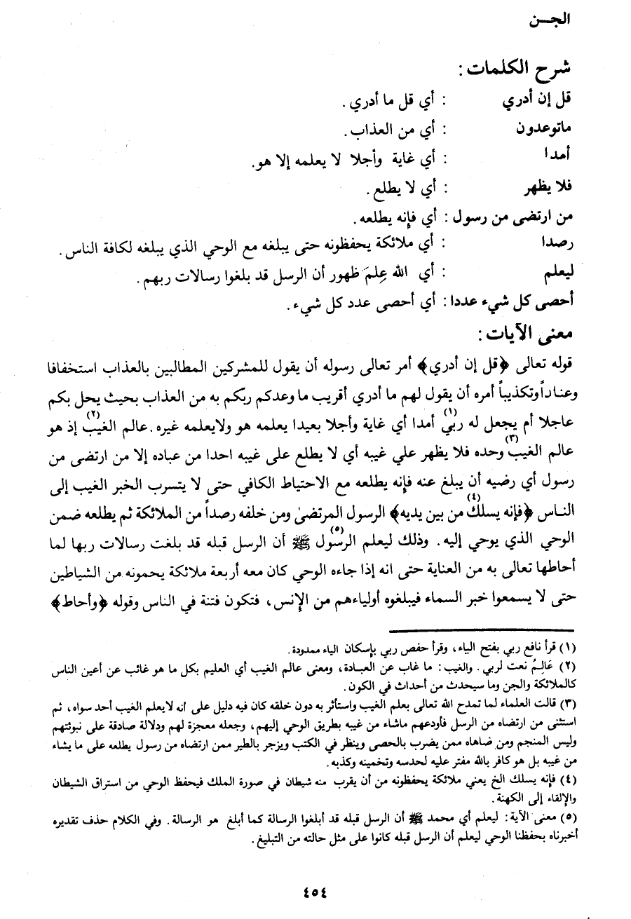 قوله تعالى {قُلْ إِنْ أَدْرِي} أمر تعالى رسوله أن يقول للمشركين المطالبين بالعذاب استخفافا وعناداً أو تكذيباً أمره أن يقول لهم ما أدري أقريب ما وعدكم ربكم به من العذاب بحيث يحل بكم عاجلا أم يجعل له ربي1 أمدا أي غاية وأجلا بعيدا يعلمه هو ولا يعلمه غيره. عالم الغيب2 إذ هو عالم الغيب3 وحده فلا يظهر على غيبه أي لا يطلع على غيبه أحدا من عباده إلا من ارتضى من رسول أي رضيه أن يبلغ عنه فإنه يطلعه مع الاحتياط الكافي حتى لا يتسرب الخبر الغيب إلى الناس {فَإِنَّهُ يَسْلُكُ4 مِنْ بَيْنِ يَدَيْهِ} الرسول المرتضى ومن خلفه رصداً من الملائكة ثم يطلعه ضمن الوحي الذي يوحي إليه. وذلك ليعلم الرسول5 صَلَّى اللهُ عَلَيْهِ وَسَلَّمَ أن الرسل قبله قد بلغت رسالات ربها لما أحاطها تعالى به من العناية حتى انه إذا جاءه الوحي كان معه أربعة ملائكة يحمونه من الشياطين حتى لا يسمعوا خبر السماء فيبلغوه أولياءهم من الإنس، فتكون فتنة في الناس وقوله {وَأَحَاطَ}