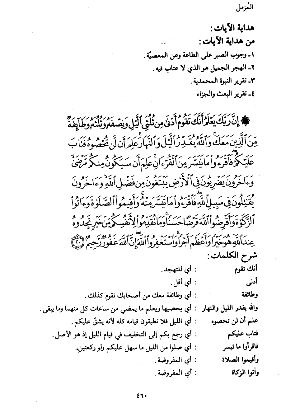 إِنَّ رَبَّكَ يَعْلَمُ أَنَّكَ تَقُومُ أَدْنَى مِنْ ثُلُثَيِ اللَّيْلِ وَنِصْفَهُ وَثُلُثَهُ وَطَائِفَةٌ مِنَ الَّذِينَ مَعَكَ وَاللهُ يُقَدِّرُ اللَّيْلَ وَالنَّهَارَ عَلِمَ أَنْ لَنْ تُحْصُوهُ فَتَابَ عَلَيْكُمْ فَاقْرَأُوا مَا تَيَسَّرَ مِنَ الْقُرْآنِ عَلِمَ أَنْ سَيَكُونُ مِنْكُمْ مَرْضَى وَآخَرُونَ يَضْرِبُونَ فِي الْأَرْضِ يَبْتَغُونَ مِنْ فَضْلِ اللهِ وَآخَرُونَ يُقَاتِلُونَ فِي سَبِيلِ اللهِ فَاقْرَأُوا مَا تَيَسَّرَ مِنْهُ وَأَقِيمُوا الصَّلاةَ وَآتُوا الزَّكَاةَ وَأَقْرِضُوا اللهَ قَرْضاً حَسَناً وَمَا تُقَدِّمُوا لِأَنْفُسِكُمْ مِنْ خَيْرٍ تَجِدُوهُ عِنْدَ اللهِ هُوَ خَيْراً وَأَعْظَمَ أَجْراً وَاسْتَغْفِرُوا اللهَ إِنَّ اللهَ غَفُورٌ رَحِيمٌ (20)