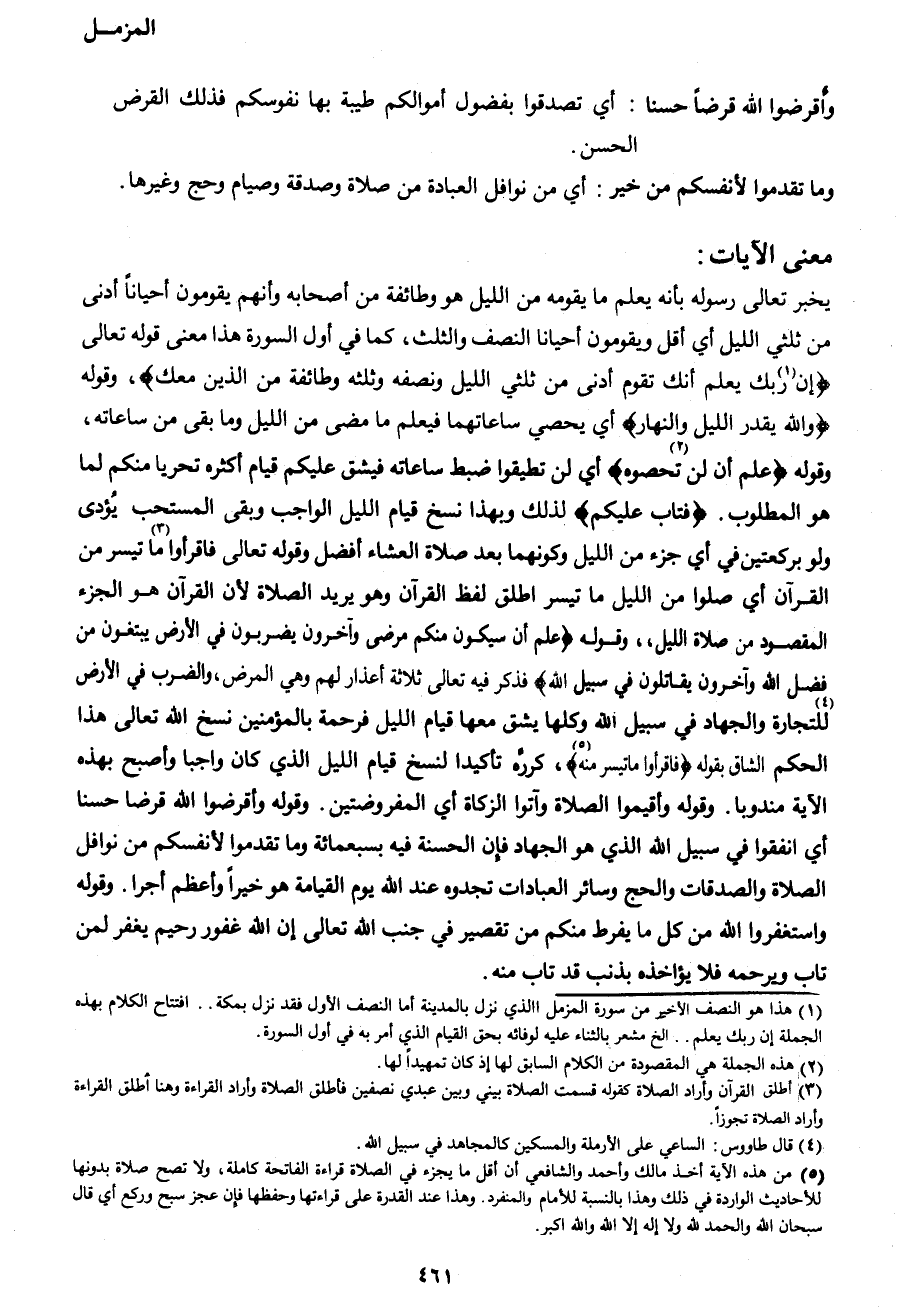 يخبر تعالى رسوله بأنه يعلم ما يقومه من الليل هو وطائفة من أصحابه وأنهم يقومون أحياناً أدنى من ثلثي الليل أي أقل ويقومون أحيانا النصف والثلث، كما في أول السورة هذا معنى قوله تعالى {إِنَّ1 رَبَّكَ يَعْلَمُ أَنَّكَ تَقُومُ أَدْنَى مِنْ ثُلُثَيِ اللَّيْلِ وَنِصْفَهُ وَثُلُثَهُ وَطَائِفَةٌ مِنَ الَّذِينَ مَعَكَ} وقوله {وَاللهُ يُقَدِّرُ اللَّيْلَ وَالنَّهَارَ} أي يحصي ساعاتهما فيعلم ما مضى من الليل وما بقي من ساعاته، وقوله {عَلِمَ أَنْ لَنْ2 تُحْصُوهُ} أي لن تطيقوا ضبط ساعاته فيشق عليكم قيام أكثره تحريا منكم لما هو المطلوب. {فَتَابَ عَلَيْكُمْ} لذلك وبهذا نسخ قيام الليل الواجب وبقى المستحب يؤدى ولو بركعتين في أي جزء من الليل وكونهما بعد صلاة العشاء أفضل وقوله تعالى {فاقرأوا3 ما تيسر من القرآن} أي صلوا من الليل ما تيسر أطلق لفظ القرآن وهو يريد الصلاة لأن القرآن هو الجزء المقصود من صلاة الليل،، وقوله {عَلِمَ أَنْ سَيَكُونُ مِنْكُمْ مَرْضَى وَآخَرُونَ يَضْرِبُونَ فِي الْأَرْضِ يَبْتَغُونَ مِنْ فَضْلِ اللهِ وَآخَرُونَ يُقَاتِلُونَ فِي سَبِيلِ اللهِ} فذكر فيه تعالى ثلاثة أعذار لهم وهي المرض، والضرب في الأرض4 للتجارة والجهاد في سبيل الله وكلها يشق معها قيام الليل فرحمة بالمؤمنين نسخ الله تعالى هذا الحكم الشاق بقوله {فَاقْرَأُوا مَا تَيَسَّرَ مِنَه5} ، كرره تأكيدا لنسخ قيام الليل الذي كان واجبا وأصبح بهذه الآية مندوبا. وقوله وأقيموا الصلاة وآتوا الزكاة أي المفروضتين. وقوله وأقرضوا الله قرضا حسنا أي أنفقوا في سبيل الله الذي هو الجهاد فإن الحسنة فيه بسبعمائة وما تقدموا لأنفسكم من نوافل الصلاة والصدقات والحج وسائر العبادات تجدوه عند الله يوم القيامة هو خيراً وأعظم أجرا. وقوله واستغفروا الله من كل ما يفرط منكم من تقصير في جنب الله تعالى إن الله غفور رحيم يغفر لمن تاب ويرحمه فلا يؤاخذه بذنب قد تاب منه.