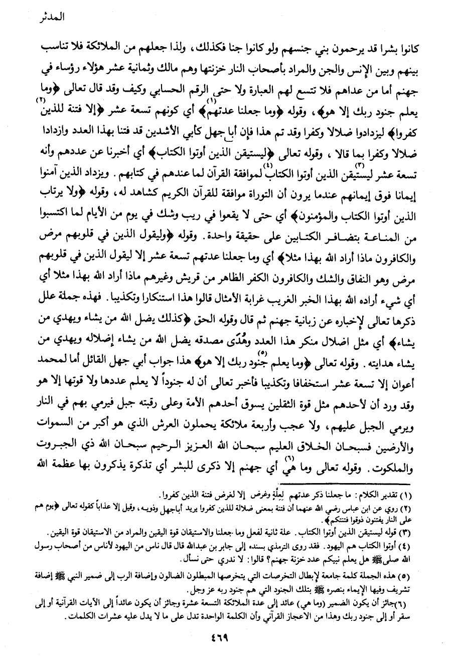 كانوا بشرا قد يرحمون بني جنسهم ولو كانوا جنا فكذلك، ولذا جعلهم من الملائكة فلا تتناسب بينهم وبين الإنس والجن والمراد بأصحاب النار خزنتها وهم مالك وثمانية عشر هؤلاء رؤساء في جهنم أما من عداهم فلا تتسع لهم العبارة ولا حتى الرقم الحسابي وكيف وقد قال تعالى {وَمَا يَعْلَمُ جُنُودَ رَبِّكَ إِلَّا هُوَ} ، وقوله {وَمَا جَعَلْنَا عِدَّتَهُمْ1} أي كونهم تسعة عشر {إِلَّا فِتْنَةً لِلَّذِينَ2 كَفَرُوا} ليزدادوا ضلالا وكفرا وقد تم هذا فإن أبا جهل كأبي الأشدين قد فتنا بهذا العدد وازدادا ضلالا وكفرا بما قالا، وقوله تعالى {لِيَسْتَيْقِنَ الَّذِينَ أُوتُوا الْكِتَابَ} أي أخبرنا عن عددهم وأنه تسعة عشر ليستيقن3 الذين أوتوا الكتاب4 لموافقة القرآن لما عندهم في كتابهم. ويزداد الذين أمنوا إيمانا فوق إيمانهم عندما يرون أن التوراة موافقة للقرآن الكريم كشاهد له، وقوله {وَلا يَرْتَابَ الَّذِينَ أُوتُوا الْكِتَابَ وَالْمُؤْمِنُونَ} أي حتى لا يقعوا في ريب وشك في يوم من الأيام لما اكتسبوا من المناعة بتضافر الكتابين على حقيقة واحدة. وقوله {وَلِيَقُولَ الَّذِينَ فِي قُلُوبِهِمْ مَرَضٌ وَالْكَافِرُونَ مَاذَا أَرَادَ اللهُ بِهَذَا مَثَلاً} أي وما جعلنا عدتهم تسعة عشر إلا ليقول الذين في قلوبهم مرض وهو النفاق والشك والكافرون الكفر الظاهر من قريش وغيرهم ماذا أراد الله بهذا مثلا أي أي شيء أراده الله بهذا الخبر الغريب غرابة الأمثال قالوا هذا استنكارا وتكذيبا. فهذه جملة علل ذكرها تعالى لإخباره عن زبانية جهنم ثم قال وقوله الحق {كَذَلِكَ يُضِلُّ اللهُ مَنْ يَشَاءُ وَيَهْدِي مَنْ يَشَاءُ} أي مثل إضلال منكر هدا العدد وهدى مصدقه يضل الله من يشاء إضلاله ويهدي من يشاء هدايته. وقوله تعالى {وَمَا يَعْلَمُ 5جُنُودَ رَبِّكَ إِلَّا هُوَ} هذا جواب أبي جهل القائل أما لمحمد أعوان إلا تسعة عشر استخفافا وتكذيبا فأخبر تعالى أن له جنوداً لا يعلم عددها ولا قوتها إلا هو وقد ورد أن لأحدهم مثل قوة الثقلين يسوق أحدهم الأمة وعلى رقبته جبل فيرمي بهم في النار ويرمي الجبل عليهم، ولا عجب وأربعة ملائكة يحملون العرش الذي هو أكبر ممن السموات والأرضين فسبحان الخلاق العليم سبحان الله العزيز الرحيم سبحان الله ذي الجبروت والملكوت. وقوله تعالى وما هي6 أي جهنم إلا ذكرى للبشر أي تذكرة يذكرون بها عظمة الله