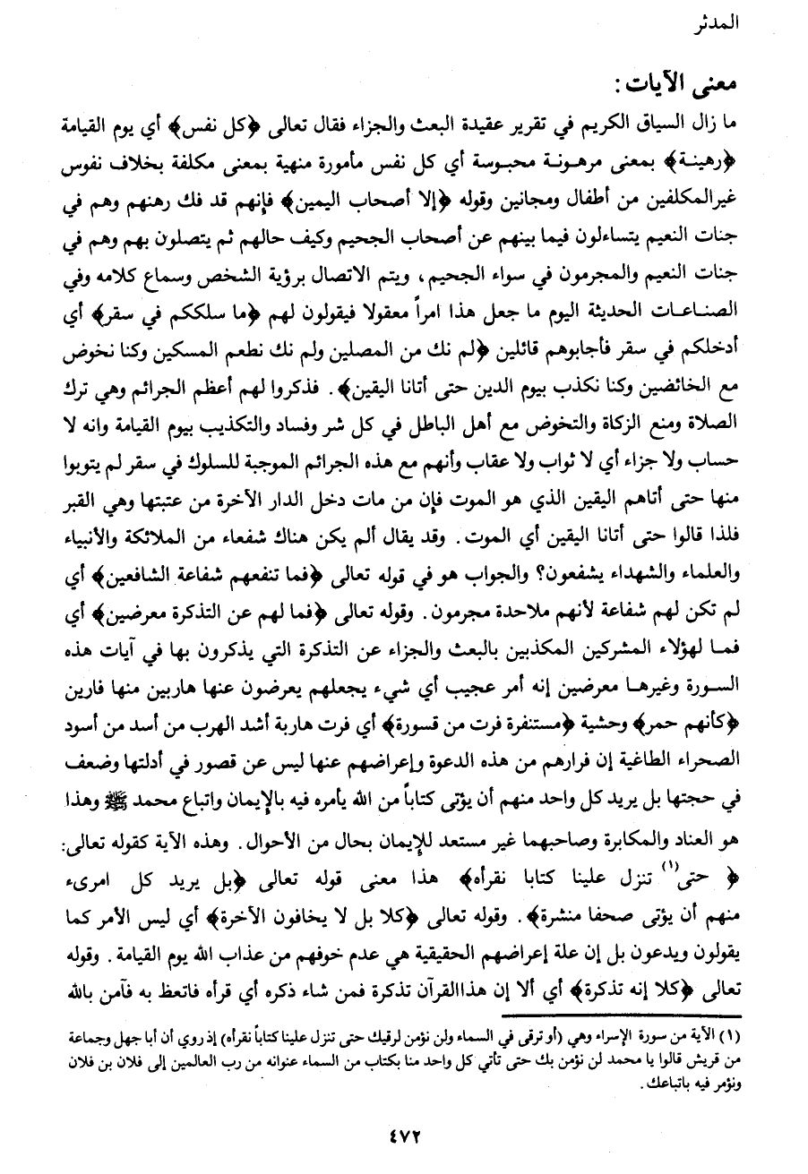 ما زال السياق الكريم في تقرير عقيدة البعث والجزاء فقال تعالى {كُلُّ نَفْسٍ} أي يوم القيامة {رَهِينَةٌ} بمعنى مرهونة محبوسة أي كل نفس مأمورة منهية بمعنى مكلفة بخلاف نفوس غير المكلفين من أطفال ومجانين وقوله {إِلَّا أَصْحَابَ الْيَمِينِ} فإنهم قد فك رهنهم وهم في جنات النعيم يتساءلون فيما بينهم عن أصحاب الجحيم وكيف حالهم ثم يتصلون بهم وهم في جنات النعيم والمجرمون في سواء الجحيم، ويتم الاتصال برؤية الشخص وسماع كلامه وفي الصناعات الحديثة اليوم ما جعل هذا أمراً معقولا فيقولون لهم {مَا سَلَكَكُمْ فِي سَقَرَ} أي أدخلكم في سقر فأجابوهم قائلين {قَالُوا لَمْ نَكُ مِنَ الْمُصَلِّينَ وَلَمْ نَكُ نُطْعِمُ الْمِسْكِينَ وَكُنَّا نَخُوضُ مَعَ الْخَائِضِينَ وَكُنَّا نُكَذِّبُ بِيَوْمِ الدِّينِ حَتَّى أَتَانَا الْيَقِينُ} فذكروا لهم أعظم الجرائم وهي ترك الصلاة ومنع الزكاة والتخوض مع أهل الباطل في كل شر وفساد والتكذيب بيوم القيامة وأنه لا حساب ولا جزاء أي لا ثواب ولا عقاب وأنهم مع هذه الجرائم الموجبة للسلوك في سقر لم يتوبوا منها حتى أتاهم اليقين الذي هو الموت فإن من مات دخل الدار الآخرة من عتبتها وهي القبر فلذا قالوا حتى أتانا اليقين أي الموت. وقد يقال ألم يكن هناك شفعاء من الملائكة والأنبياء والعلماء والشهداء يشفعون؟ والجواب هو في قوله تعالى {فَمَا تَنْفَعُهُمْ شَفَاعَةُ الشَّافِعِينَ} أي لم تكن لهم شفاعة لأنهم ملاحدة مجرمون. وقوله تعالى {فَمَا لَهُمْ عَنِ التَّذْكِرَةِ مُعْرِضِينَ} أي فما لهؤلاء المشركين المكذبين بالبعث والجزاء عن التذكرة التي يذكرون بها في آيات هذه السورة وغيرها معرضين إنه أمر عجيب أي شيء يجعلهم يعرضون عنها هاربين منها فارين {كَأَنَّهُمْ حُمُرٌ} وحشية {مُسْتَنْفِرَةٌ فَرَّتْ مِنْ قَسْوَرَةٍ} أي فرت هاربة أشد الهرب من أسد من أسود الصحراء الطاغية إن فرارهم من هذه الدعوة وإعراضهم عنها ليس عن قصور في أدلتها وضعف في حجتها بل يريد كل واحد منهم أن يؤتى كتاباً من الله يأمره فيه بالإيمان واتباع محمد صَلَّى اللهُ عَلَيْهِ وَسَلَّمَ وهذا هو العناد والمكابرة وصاحبهما غير مستعد للإيمان بحال من الأحوال. وهذه الآية كقوله تعالى: {حَتَّى1 تُنَزِّلَ عَلَيْنَا كِتَاباً نَقْرَأُهُ} هذا معنى قوله تعالى {بَلْ يُرِيدُ كُلُّ امْرِئٍ مِنْهُمْ أَنْ يُؤْتَى صُحُفاً مُنَشَّرَةً} . وقوله تعالى {كَلَّا بَلْ لا يَخَافُونَ الْآخِرَةَ} أي ليس الأمر كما يقولون ويدعون بل إن علة إعراضهم الحقيقية هي عدم خوفهم من عذاب الله يوم القيامة. وقوله تعالى {كَلَّا إِنَّهَا تَذْكِرَةٌ} أي ألا إن هذا القرآن تذكرة فمن شاء ذكره أي قرأه فاتعظ به فآمن بالله
