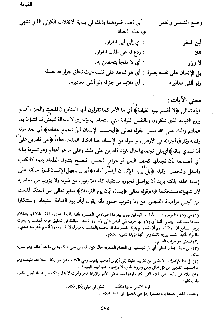 قوله تعالى {لا أُقْسِمُ بِيَوْمِ الْقِيَامَةِ} 1 أي ما الأمر كما تقولون أيها المنكرون للبعث والجزاء أقسم بيوم القيامة الذي تنكرون وبالنفس اللوامة التي ستحاسب وتجزي لا محالة لتبعثن2 ثم لتنبؤن بما عملتم وذلك على الله يسير. وقوله تعالى {أَيَحْسَبُ الْإنْسَانُ أَلَّنْ نَجْمَعَ عِظَامَهُ} أي بعد موته وفنائه وتفرق أجزائه في الأرض، والمراد من الإنسان هنا الكافر الملحد قطعاً {بَلَى قَادِرِينَ عَلَى3 أَنْ نُسَوِّيَ بَنَانَهُ} أي بلى نجمعها حال كوننا قادرين على ذلك وعلى ما هو أعظم وهو تسوية بنانه أي أصابعه بأن نجعلها كخف البعير أو حوافر الحمير، فيصبح يتناول الطعام بفمه كالكلب والبغل والحمار. وقوله {بَلْ4 يُرِيدُ الْأِنْسَانُ لِيَفْجُرَ5 أَمَامَهُ} أي ما يجهل الإنسان قدرة خالقه على إعادة خلقه ولكنه يريد أن يواصل فجوره مستقبله كله فلا يتوب من ذنوبه ولا يؤوب من معاصيه لأن شهواته مستحكمة فيه، وقوله تعالى {يَسْأَلُ أَيَّانَ يَوْمُ الْقِيَامَةِ؟} يخبر تعالى عن المنكر للبعث من أحل مواصلة الفجور من زنا وشرب خمور بأنه يقول أيان يوم القيامة استبعادا واستنكارا
