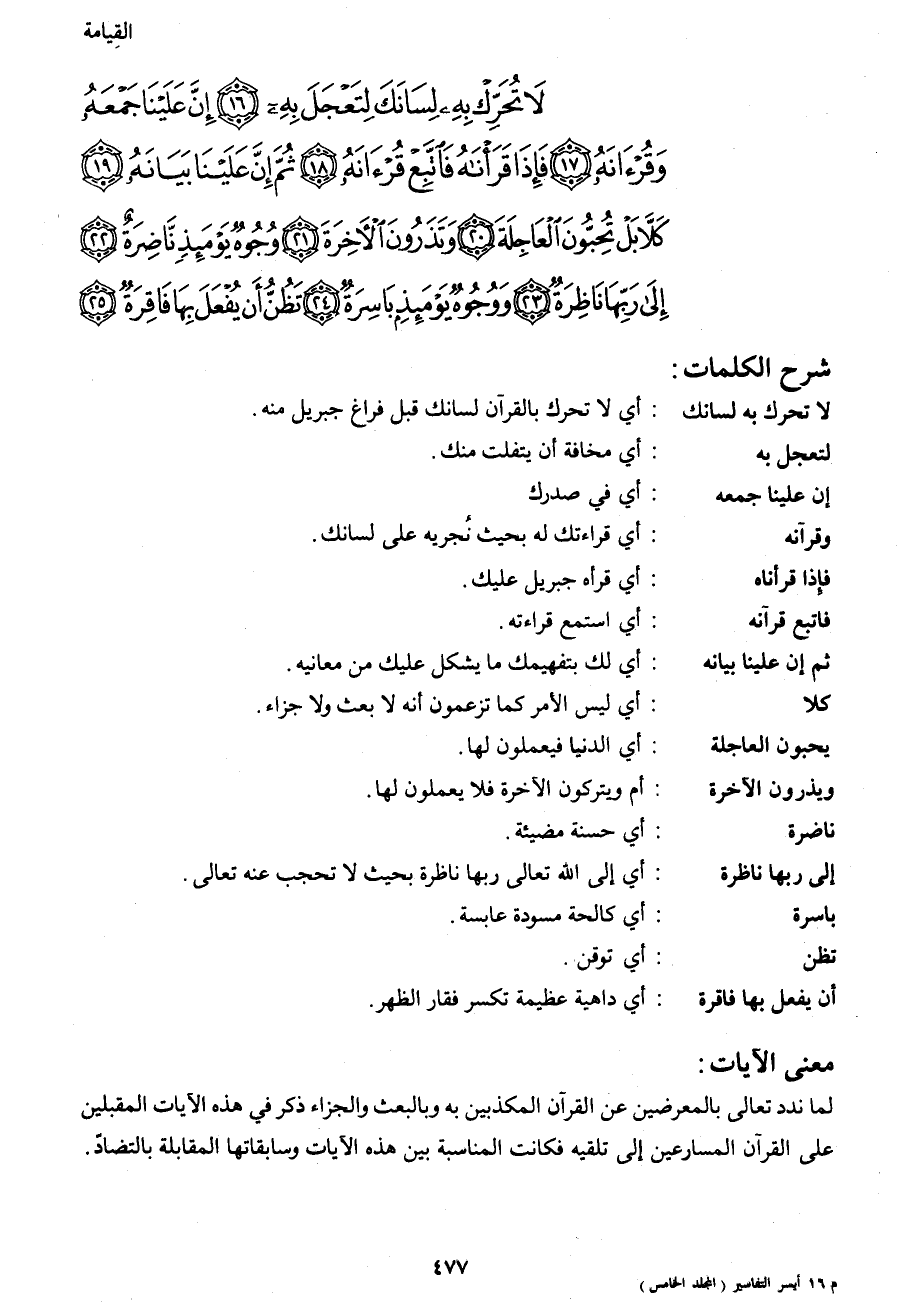 لا تُحَرِّكْ بِهِ لِسَانَكَ لِتَعْجَلَ بِهِ (16) إِنَّ عَلَيْنَا جَمْعَهُ وَقُرْآنَهُ (17) فَإِذَا قَرَأْنَاهُ فَاتَّبِعْ قُرْآنَهُ (18) ثُمَّ إِنَّ عَلَيْنَا بَيَانَهُ (19) كَلَّا بَلْ تُحِبُّونَ الْعَاجِلَةَ (20) وَتَذَرُونَ الْآخِرَةَ (21) وُجُوهٌ يَوْمَئِذٍ نَاضِرَةٌ (22) إِلَى رَبِّهَا نَاظِرَةٌ (23) وَوُجُوهٌ يَوْمَئِذٍ بَاسِرَةٌ (24) تَظُنُّ أَنْ يُفْعَلَ بِهَا فَاقِرَةٌ (25)