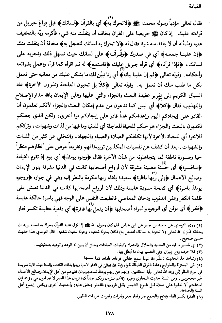 فقال تعالى مؤدباً رسوله محمدا صَلَّى اللهُ عَلَيْهِ وَسَلَّمَ {لا تُحَرِّكْ بِهِ1} أي بالقرآن {لِسَانَكَ} قبل فراغ جبريل من قراءته عليك. إذ كان صَلَّى اللهُ عَلَيْهِ وَسَلَّمَ حريصا على القرآن يخاف أن يتفلت منه شيء فأكرمه ربه بالتخفيف عليه وطمأنه أن لا يفقد منه شيئا فقال له {لا تُحَرِّكْ بِهِ لِسَانَكَ لِتَعْجَلَ بِهِ} مخافة أن يتفلت منك {إِنَّ عَلَيْنَا جَمْعَهُ} أي في صدرك {وَقُرْآنَهُ} على لسانك حيث نسهل ذلك ونجريه على لسانك، {فَإِذَا قَرَأْنَاهُ} أي قرأه جبريل عليك {فَاسْتَمِعْ} له ثم اقرأه كما قرأه واعمل بشرائعه وأحكامه. وقوله تعالى {ثُمَّ إِنَّ عَلَيْنَا بَيَانَهُ2} أي إنا نبين لك ما يشكل عليك من معانيه حتى تعمل بكل ما طلب منك أن تعمل به. وقوله تعالى {كَلَّا بَلْ تُحِبُّونَ الْعَاجِلَةَ وَتَذَرُونَ الْآخِرَةَ} عاد السياق الكريم إلى تقرير عقيدة البعث والجزاء والتي عليها وعلى الإيمان بالله مدار الإصلاح والتهذيب فقال {كَلَّا3} أي ليس كما تدعون من عدم إمكان البعث والجزاء لأنكم تعلمون أن القادر على إيجادكم اليوم وإعدامكم غداً قادر على إيجادكم مرة أخرى، ولكن الذي جعلكم تكذبون بالبعث والجزاء هو حبكم للحياة العاجلة أي الدنيا وما فيها من لذات وشهوات، وترككم للآخرة أي للحياة الآخرة لأنها تكلفكم الصلاة والصيام والجهاد، والتخلي عن كثير من اللذات والشهوات. بعد أن كشف عن نفسيات المكذبين توبيخا لهم وتقريعاً عرض على أنظارهم منظراً حيا وصورة ناطقة لما يتجاهلونه من شأن الآخرة فقال {وُجُوهٌ يَوْمَئِذٍ} أي يوم إذ تقوم القيامة {نَاضِرَةٌ} أي حسنة4مضيئة مشرقة لأن أرواح أصحابها كانت في الدنيا مشرقة بنور الإيمان وصالح الأعمال {إِلَى رَبِّهَا5 نَاظِرَةٌ} سعيدة بلقاء ربها مكرمة بالنظر إليه وهي في جواره {وَوُجُوهٌ يَوْمَئِذٍ بَاسِرَةٌ} أي كالحة مسودة عابسة وذلك لأن أرواح أصحابها كانت في الدنيا تعيش على ظلمة الكفر وعفن الذنوب ودخان المعاصي فانطبعت النفس على الوجه فهي باسرة حالكة عابسة {تَظُنُّ} أي توقن أي الوجوه والمراد أصحابها {أَنْ يُفْعَلَ6 بِهَا فَاقِرَةٌ} أي داهية عظيمة تكسر فقار
