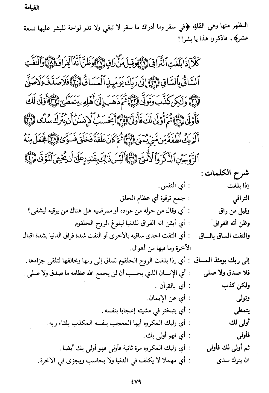 كَلَّا إِذَا بَلَغَتِ التَّرَاقِيَ (26) وَقِيلَ مَنْ رَاقٍ (27) وَظَنَّ أَنَّهُ الْفِرَاقُ (28) وَالْتَفَّتِ السَّاقُ بِالسَّاقِ (29) إِلَى رَبِّكَ يَوْمَئِذٍ الْمَسَاقُ (30) فَلا صَدَّقَ وَلا صَلَّى (31) وَلَكِنْ كَذَّبَ وَتَوَلَّى (32) ثُمَّ ذَهَبَ إِلَى أَهْلِهِ يَتَمَطَّى (33) أَوْلَى لَكَ فَأَوْلَى (34) ثُمَّ أَوْلَى لَكَ فَأَوْلَى (35) أَيَحْسَبُ الْأِنْسَانُ أَنْ يُتْرَكَ سُدىً (36) أَلَمْ يَكُ نُطْفَةً مِنْ مَنِيٍّ يُمْنَى (37) ثُمَّ كَانَ عَلَقَةً فَخَلَقَ فَسَوَّى (38) فَجَعَلَ مِنْهُ الزَّوْجَيْنِ الذَّكَرَ وَالْأُنْثَى (39) أَلَيْسَ ذَلِكَ بِقَادِرٍ عَلَى أَنْ يُحْيِيَ الْمَوْتَى (40)