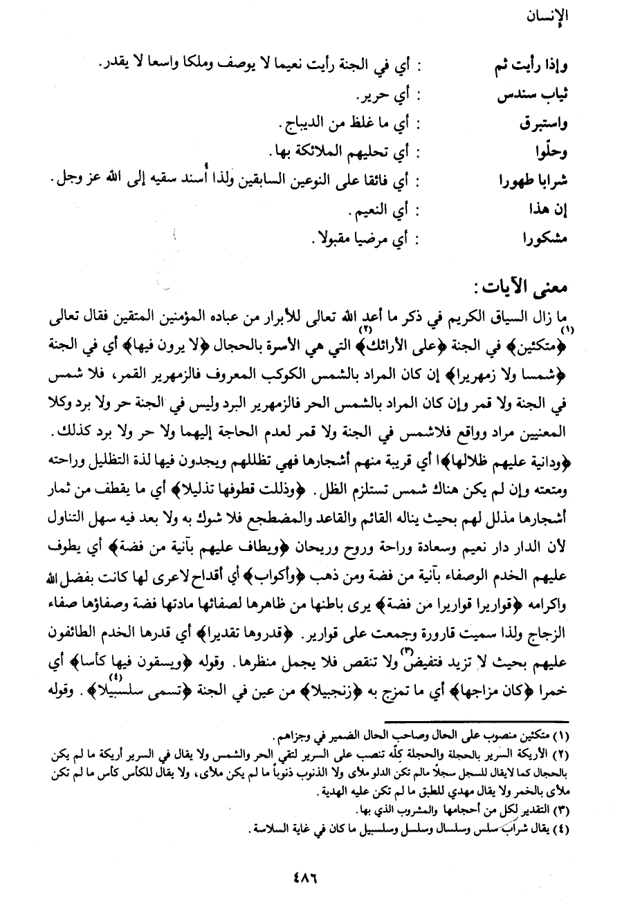 ما زال السياق الكريم في ذكر ما أعد الله تعالى للأبرار من عباده المؤمنين المتقين فقال تعالى 1 {مُتَّكِئِينَ} في الجنة {عَلَى الْأَرَائِكِ2} التي هي الأسرة بالحجال {لا يَرَوْنَ فِيهَا} أي في الجنة {شَمْساً وَلا زَمْهَرِيراً} إن كان المراد بالشمس الكوكب المعروف فالزمهرير القمر، فلا الشمس في الجنة ولا قمر وإن كان المراد بالشمس الحر فالزمهرير البرد وليس في الجنة حر ولا برد وكلا المعنيين مراد وواقع فلا شمس في الجنة ولا قمر لعدم الحاجة إليهما ولا حر ولا برد كذلك. {وَدَانِيَةً عَلَيْهِمْ ظِلالُهَا} أي قريبة منهم أشجارها فهي تظللهم ويجدون فيها لذة التظليل وراحته ومتعته وإن لم يكن هناك شمس تستلزم الظل. {وَذُلِّلَتْ قُطُوفُهَا تَذْلِيلاً} أي ما يقطف من ثمار أشجارها مذلل لهم بحيث يناله القائم والقاعد والمضطجع فلا شوك ولا بعد فيه سهل التناول لأن الدار دار نعيم وسعادة وراحة وروح وريحان {وَيُطَافُ عَلَيْهِمْ بِآنِيَةٍ مِنْ فِضَّةٍ} أي يطوف عليهم الخدم الوصفاء بآنية من فضة ومن ذهب {وَأَكْوَابٍ} أي أقداح لا عرى لها كانت بفضل الله وإكرامه {قَوَارِيرَا قَوَارِيرَا مِنْ فِضَّةٍ} يرى باطنها من ظاهرها لصفائها مادتها فضة وصفاؤها صفاء الزجاج ولذا سميت قارورة وجمعت على قوارير. {قَدَّرُوهَا تَقْدِيراً} أي قدرها الخدم الطائفون عليهم بحيث لا تزيد فتفيض3 ولا تنقص فلا يجمل منظرها. وقوله {وَيُسْقَوْنَ فِيهَا كَأْساً} أي خمرا {كَانَ مِزَاجُهَا} أي ما تمزج به {زَنْجَبِيلاً}