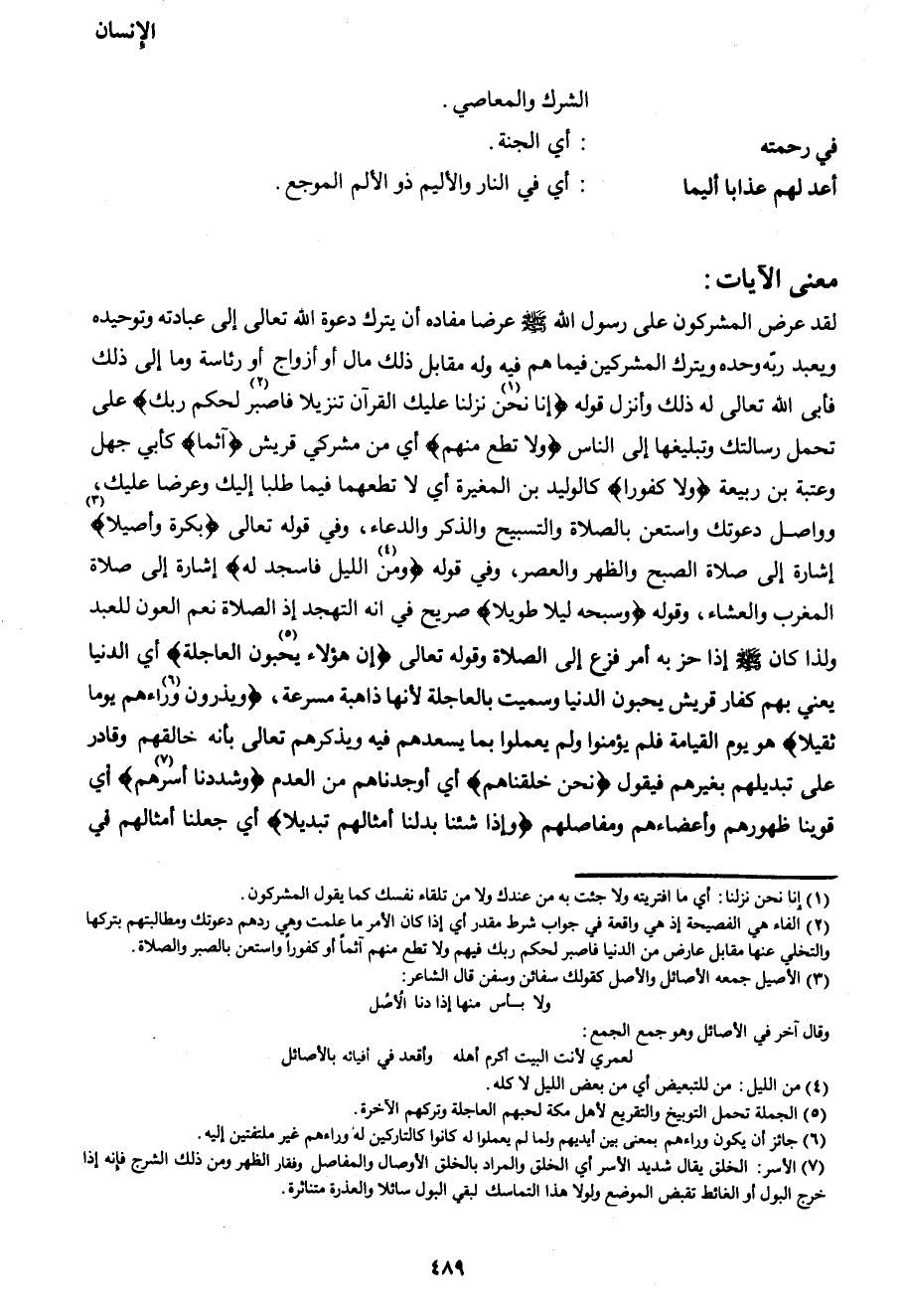 لقد عرض المشركون على رسول الله صَلَّى اللهُ عَلَيْهِ وَسَلَّمَ عرضا مفاده أن يترك دعوة الله تعالى إلى عبادته وتوحيده ويعبد ربه وحده ويترك المشركين فيما هم فيه وله مقابل ذلك مال أو أزواج أو رئاسة وما إلى ذلك فأبى الله تعالى له ذلك وأنزل قوله {إِنَّا نَحْنُ1 نَزَّلْنَا عَلَيْكَ الْقُرْآنَ تَنْزِيلاً فَاصْبِرْ2 لِحُكْمِ رَبِّكَ} على تحمل رسالتك وتبليغها إلى الناس {وَلا تُطِعْ مِنْهُمْ} أي من مشركي قريش {آثِماً} كأبي جهل وعتبة بن ربيعة {ولا كَفُوراً} كالوليد بن المغيرة أي لا تطعهما فيما طلبا إليك وعرضا عليك، وواصل دعوتك واستعن بالصلاة والتسبيح والذكر والدعاء، وفي قوله تعالى {بُكْرَةً وَأَصِيلاً} 3 إشارة إلى صلاة الصبح والظهر والعصر، وفي قوله {وَمِنَ4 اللَّيْلِ فَاسْجُدْ لَهُ} إشارة إلى صلاة المغرب والعشاء، وقوله {وَسَبِّحْهُ لَيْلاً طَوِيلاً} صريح في انه التهجد إذ الصلاة نعم العون للعبد ولذا كان صَلَّى اللهُ عَلَيْهِ وَسَلَّمَ إذا حز به أمر فزع إلى الصلاة وقوله تعالى {إِنَّ هَؤُلاءِ يُحِبُّونَ5 الْعَاجِلَةَ} أي الدنيا يعني بهم كفار قريش يحبون الدنيا وسميت بالعاجلة لأنها ذاهبة مسرعة، {وَيَذَرُونَ 6وَرَاءَهُمْ يَوْماً ثَقِيلاً} هو يوم القيامة قلم يؤمنوا ولم يعملوا بما يسعدهم فيه ويذكرهم تعالى بأنه خالقهم وقادر على تبديلهم بغيرهم فيقول {نَحْنُ خَلَقْنَاهُمْ} أي أوجدناهم من العدم {وَشَدَدْنَا أَسْرَهُمْ7} أي قوينا ظهورهم وأعضاءهم ومفاصلهم {وَإِذَا شِئْنَا بَدَّلْنَا أَمْثَالَهُمْ تَبْدِيلاً} أي جعلنا أمثالهم في