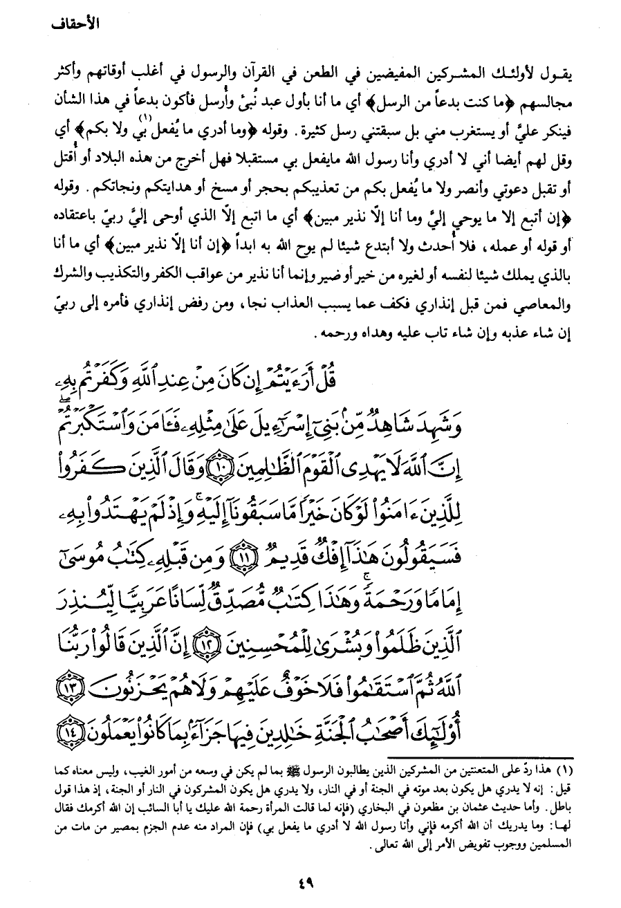 {قلْ أَرَأَيْتُمْ إِنْ كَانَ مِنْ عِنْدِ اللهِ وَكَفَرْتُمْ بِهِ وَشَهِدَ شَاهِدٌ مِنْ بَنِي إِسْرائيلَ عَلَى مِثْلِهِ فَآمَنَ وَاسْتَكْبَرْتُمْ إِنَّ اللهَ لا يَهْدِي الْقَوْمَ الظَّالِمِينَ (10) وَقَالَ الَّذِينَ كَفَرُوا لِلَّذِينَ آمَنُوا لَوْ كَانَ خَيْراً مَا سَبَقُونَا إِلَيْهِ وَإِذْ لَمْ يَهْتَدُوا بِهِ فَسَيَقُولُونَ هَذَا إِفْكٌ قَدِيمٌ (11) وَمِنْ قَبْلِهِ كِتَابُ مُوسَى إِمَاماً وَرَحْمَةً وَهَذَا كِتَابٌ مُصَدِّقٌ لِسَاناً عَرَبِيّاً لِيُنْذِرَ الَّذِينَ ظَلَمُوا وَبُشْرَى (12) إِنَّ الَّذِينَ قَالُوا رَبُّنَا اللهُ ثُمَّ اسْتَقَامُوا فَلا خَوْفٌ عَلَيْهِمْ وَلا هُمْ يَحْزَنُونَ (13) إِنَّ الَّذِينَ قَالُوا رَبُّنَا اللهُ ثُمَّ اسْتَقَامُوا فَلا خَوْفٌ عَلَيْهِمْ وَلا هُمْ يَحْزَنُونَ (14) }