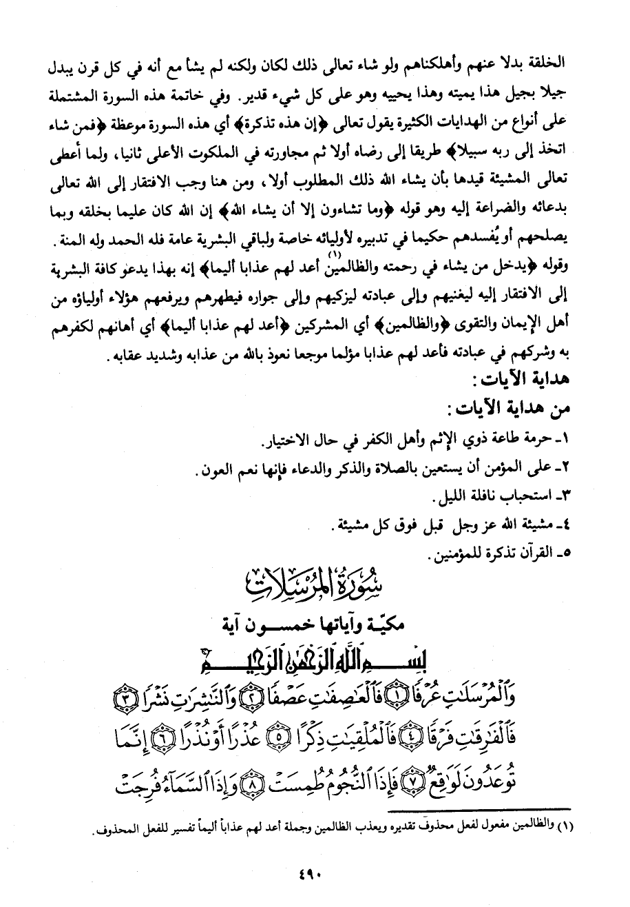 وَالْمُرْسَلاتِ عُرْفاً (1) فَالْعَاصِفَاتِ عَصْفاً (2) وَالنَّاشِرَاتِ نَشْراً (3) فَالْفَارِقَاتِ فَرْقاً (4) فَالْمُلْقِيَاتِ ذِكْراً (5) عُذْراً أَوْ نُذْراً (6) إِنَّمَا تُوعَدُونَ لَوَاقِعٌ (7) فَإِذَا النُّجُومُ طُمِسَتْ (8) وَإِذَا السَّمَاءُ فُرِجَتْ