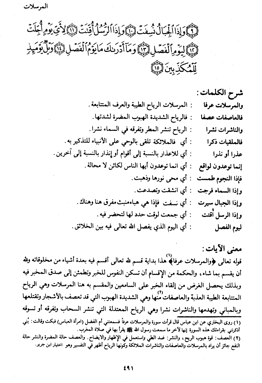 قوله تعالى {وَالْمُرْسَلاتِ عُرْفاً} 1 هذا بداية قسم لله تعالى أقسم فيه بعدة أشياء من مخلوقاته ولله أن يقسم بما شاء، والحكمة من الإقسام أن تسكن النفوس للخبر وتطمئن إلى صدق المخبر فيه وبذلك يحصل الغرض من إلقاء الخبر على السامعين والمقسم به هنا المرسلات وهي الرياح المتتابعة الطيبة العذبة والعاصفات2 منها وهي الشديدة الهبوب التي قد تعصف بالأشجار وتقتلعها وبالمباني وتهدمها والناشرات نشرا وهي الرياح المعتدلة التي تنشر السحاب وتفرقة أو تسوقه