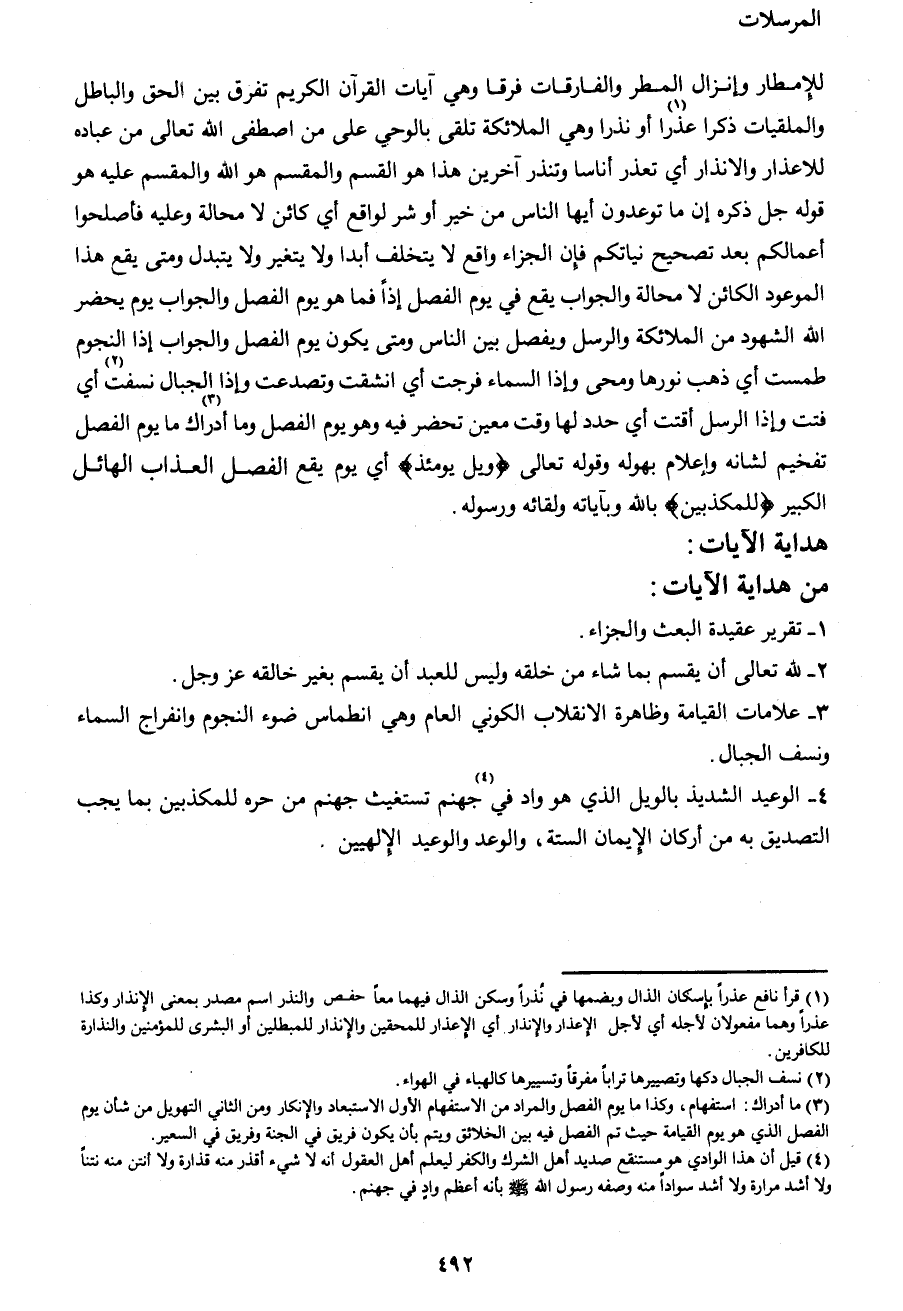 1 قرأ نافع عذراً بإسكان الذال وبضمها في نذراً وسكن الذال فيهما معاً حفص والنذر اسم مصدر بمعنى الإنذار وكذا عذراً وهما مفعولان لأجله أي لأجل الإعذار والإنذار أي الإعذار للمحقين والإنذار للمبطلين أو البشرى للمؤمنين والنذارة للكافرين.