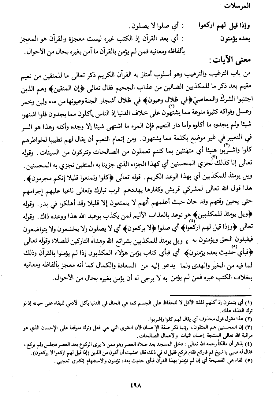 من باب الترغيب والترهيب وهو أسلوب أمتاز به القرآن الكريم ذكر تعالى ما للمتقين من نعيم مقيم بعد ذكر ما للمكذبين الضالين من عذاب الجحيم فقال تعالى {إِنَّ الْمُتَّقِينَ} وهم الذين اجتنبوا الشرك والمعاصي {فِي ظِلالٍ وَعُيُونٍ} في ظلال أشجار الجنة وعيونها من ماء ولبن وخمر وعسل وفواكه كثيرة منوعة مما يشتهون1 على خلاف الدنيا إذ الناس يأكلون مما يجدون فلوا اشتهوا شيئا ولم يجدوه ما أكلوه وأما دار النعيم فإن المرء ما اشتهى شيئا إلا وجده وأكله وهذا هو السر في التعبير في غير موضع بكلمة مما يشتهون. ومن إتمام النعيم أن يقال لهم تطييبا لخواطرهم كلوا واشربوا2 هنيئا أي متهنئين بما كنتم تعملون من الصالحات وتتركون من السيئات. وقوله تعالى إنا كذلك3 نجزي المحسنين أي كهذا الجزاء الذي جزينا به المتقين نجزي به المحسنين. ويل يومئذ للمكذبين أي بهذا الوعد الكريم. قوله تعالى {كُلُوا وَتَمَتَّعُوا قَلِيلاً إِنَّكُمْ مُجْرِمُونَ} . هذا قول الله تعالى لمشركي قريش وكفارها يهددهم الرب تبارك وتعالى ناعيا عليهم إجرامهم حتى يحين وقتهم وقد حان حيث أعلمهم أنهم لا يتمتعون إلا قليلا وقد أهلكوا في بدر. وقوله {وَيْلٌ يَوْمَئِذٍ لِلْمُكَذِّبِينَ} هو توعد بالعذاب الأليم لمن يكذب بوعيد الله هذا ووعده ذاك. وقوله تعالى {وَإِذَا قِيلَ لَهُمُ ارْكَعُوا4} أي صلوا {لا يَرْكَعُونَ} أي لا يصلون ولا يخشعون ولا يتواضعون فيقبلون الحق ويؤمنون به، ويل يومئذ للمكذبين بشرائع الله وهداه التاركين للصلاة وقوله تعالى {فَبِأَيِّ 5حَدِيثٍ بَعْدَهُ يُؤْمِنُونَ} أي فبأي كتاب يؤمن هؤلاء المكذبون إذا لم يؤمنوا بالقرآن وذلك لما فيه من الخير والهدى ولما يدعوا إليه من السعادة والكمال كما أنه معجز بألفاظه ومعانيه بخلاف الكتب غيره فمن لم يؤمن به لا يرجى له أن يؤمن بغيره بحال من الأحوال.