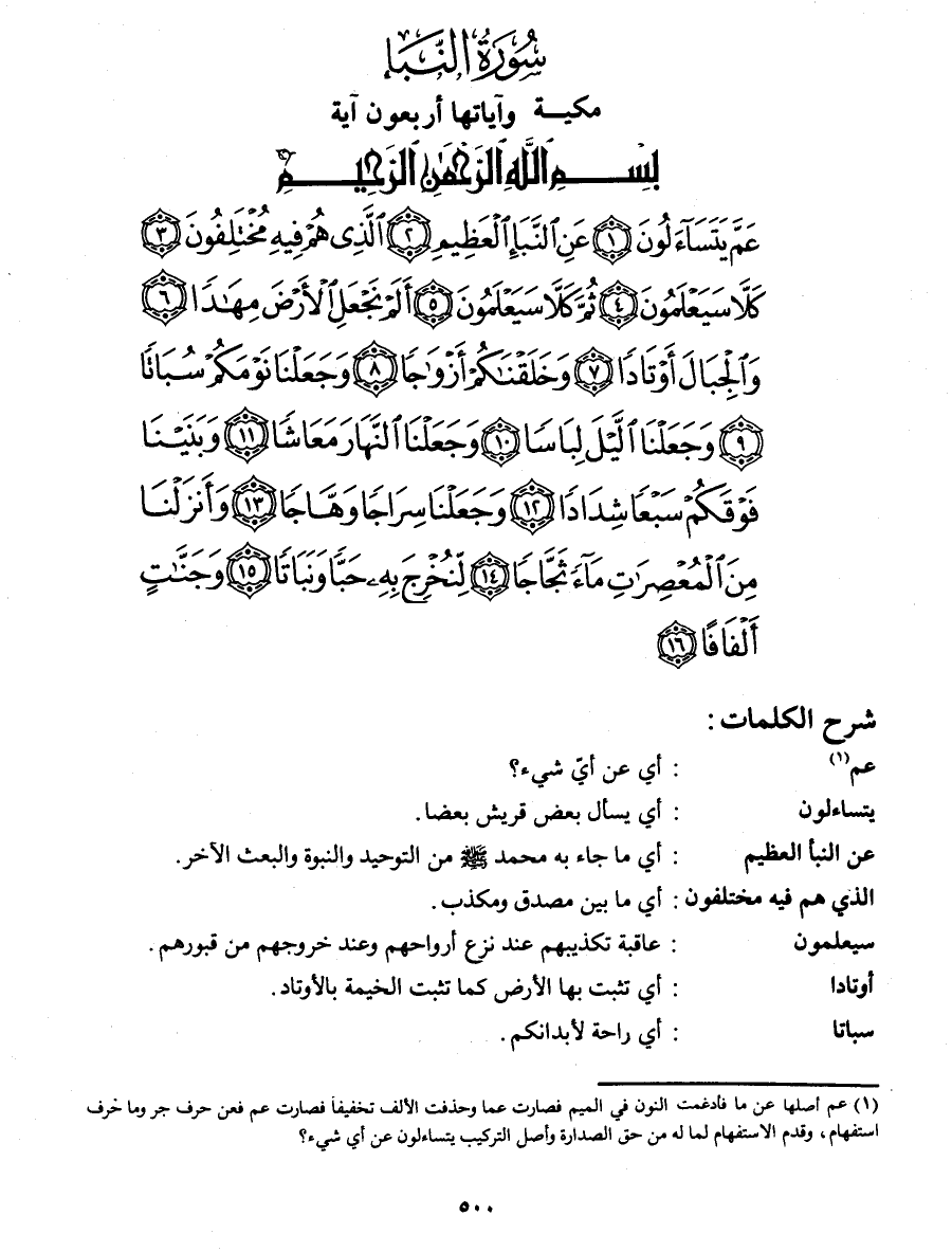 عَمَّ يَتَسَاءَلُونَ (1) عَنِ النَّبَأِ الْعَظِيمِ (2) الَّذِي هُمْ فِيهِ مُخْتَلِفُونَ (3) كَلَّا سَيَعْلَمُونَ (4) ثُمَّ كَلَّا سَيَعْلَمُونَ (5) أَلَمْ نَجْعَلِ الْأَرْضَ مِهَاداً (6) وَالْجِبَالَ أَوْتَاداً (7) وَخَلَقْنَاكُمْ أَزْوَاجاً (8) وَجَعَلْنَا نَوْمَكُمْ سُبَاتاً (9) وَجَعَلْنَا اللَّيْلَ لِبَاساً (10) وَجَعَلْنَا النَّهَارَ مَعَاشاً (11) وَبَنَيْنَا فَوْقَكُمْ سَبْعاً شِدَاداً (12) وَجَعَلْنَا سِرَاجاً وَهَّاجاً (13) وَأَنْزَلْنَا مِنَ الْمُعْصِرَاتِ مَاءً ثَجَّاجاً (14) لِنُخْرِجَ بِهِ حَبّاً وَنَبَاتاً (15) وَجَنَّاتٍ أَلْفَافاً (16)