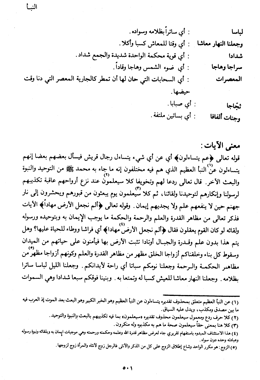 قوله تعالى {عَمَّ يَتَسَاءَلُونَ} أي عن أي شيء يتساءل رجال قريش فيسأل بعضهم بعضا إنهم يتساءلون عن1 النبأ العظيم الذي هم فيه مختلفون إنه ما جاء به محمد صَلَّى اللهُ عَلَيْهِ وَسَلَّمَ من التوحيد والنبوة والبعث الآخر. قال تعالى ردعا لهم وتخويفا كلا سيعلمون2 عند نزع أرواحهم عاقبة تكذيبهم لرسولنا وإنكارهم لتوحيدنا ولقائنا، ثم كلا سيعلمون3 يوم يبعثون من قبورهم ويحشرون إلى نار جهنم حين لا ينفعهم علم ولا يجديهم إيمان. وقوله تعالى {أَلَمْ نَجْعَلِ الْأَرْضَ مِهَاداً} الآيات فذكر تعالى من مظاهر القدرة والعلم والرحمة والحكمة ما يوجب الإيمان به وبتوحيده ورسوله ولقائه لو كان القوم يعقلون فقال {أَلَمْ نَجْعَلِ الْأَرْضَ4 مِهَاداً} أي فراشا ووطاء للحياة عليها؟ وهل يتم هذا بدون علم وقدرة والجبال أوتادا تثبت الأرض بها فيأمنون على حياتهم من الميدان وسقوط كل بناء وخلقناكم أزواجا الخلق مظهر من مظاهر القدرة والعلم وكونهم أزواجا مظهر5 من مظاهر الحكمة والرحمة وجعلنا نومكم سباتا أي راحة لأبدانكم. وجعلنا الليل لباسا ساترا بظلامه. وجعلنا النهار معاشا للعيش كسبا وتمتعا به. وبنينا فوقكم سبعا شدادا وهي السموات