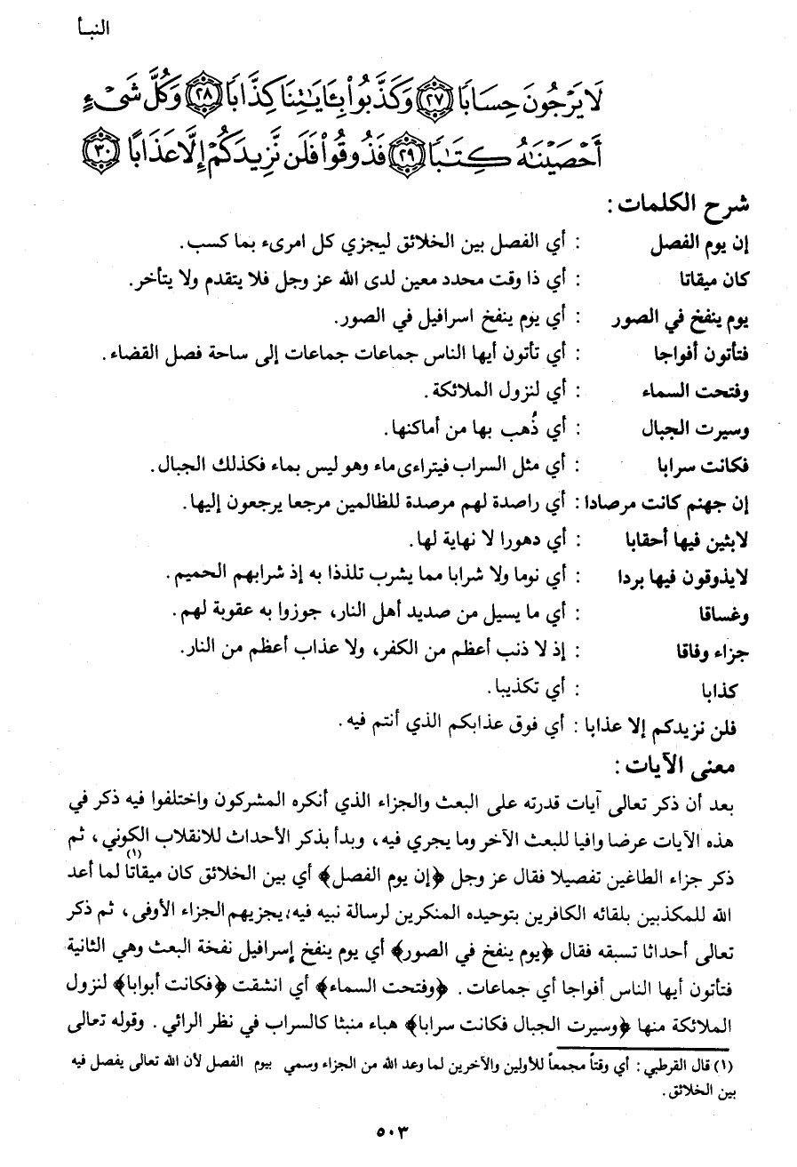 بعد أن ذكر تعالى آيات قدرته على البعث والجزاء الذي أنكره المشركون واختلفوا فيه ذكر في هذه الآيات عرضا وافيا للبعث الآخر وما يجري فيه، وبدا بذكر الأحداث للانقلاب الكوني، ثم ذكر جزاء الطاغين تفصيلا فقال عز وجل {إِنَّ يَوْمَ الْفَصْلِ} أي بين الخلائق كان ميقاتا1 لما أعد الله للمكذبين بلقائه الكافرين بتوحيده المنكرين لرسالة نبيه فيه، يجزيهم الجزاء الأوفى، ثم ذكر تعالى أحداثا تسبقه فقال {يَوْمَ يُنْفَخُ فِي الصُّورِ} أي يوم ينفخ إسرافيل نفخة البعث وهي الثانية فتأتون أيها الناس أفواجا أي جماعات. {وَفُتِحَتِ السَّمَاءُ} أي انشقت {فَكَانَتْ أَبْوَاباً} لنزول الملائكة منها {وَسُيِّرَتِ الْجِبَالُ فَكَانَتْ سَرَاباً} هباء منبثا كالسراب في نظر الرائي. وقوله تعالى