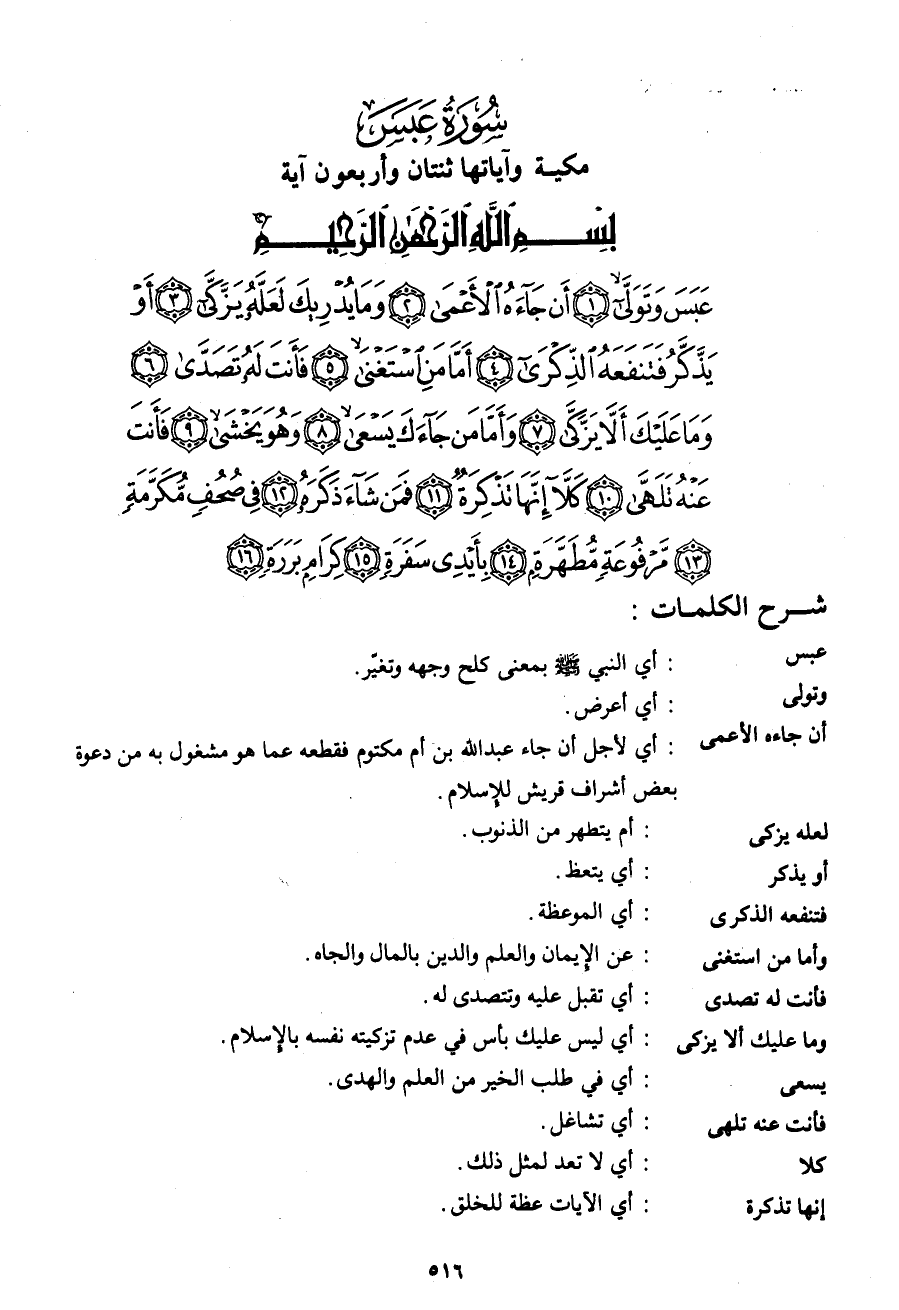 عَبَسَ وَتَوَلَّى (1) أَنْ جَاءَهُ الْأَعْمَى (2) وَمَا يُدْرِيكَ لَعَلَّهُ يَزَّكَّى (3) أَوْ يَذَّكَّرُ فَتَنْفَعَهُ الذِّكْرَى (4) أَمَّا مَنِ اسْتَغْنَى (5) فَأَنْتَ لَهُ تَصَدَّى (6) وَمَا عَلَيْكَ أَلاَّ يَزَّكَّى (7) وَأَمَّا مَنْ جَاءَكَ يَسْعَى (8) وَهُوَ يَخْشَى (9) فَأَنْتَ عَنْهُ تَلَهَّى (10) كَلاَّ إِنَّهَا تَذْكِرَةٌ (11) فَمَنْ شَاءَ ذَكَرَهُ (12) فِي صُحُفٍ مُكَرَّمَةٍ (13) مَرْفُوعَةٍ مُطَهَّرَةٍ (14) بِأَيْدِي سَفَرَةٍ (15) كِرَامٍ بَرَرَةٍ (16)