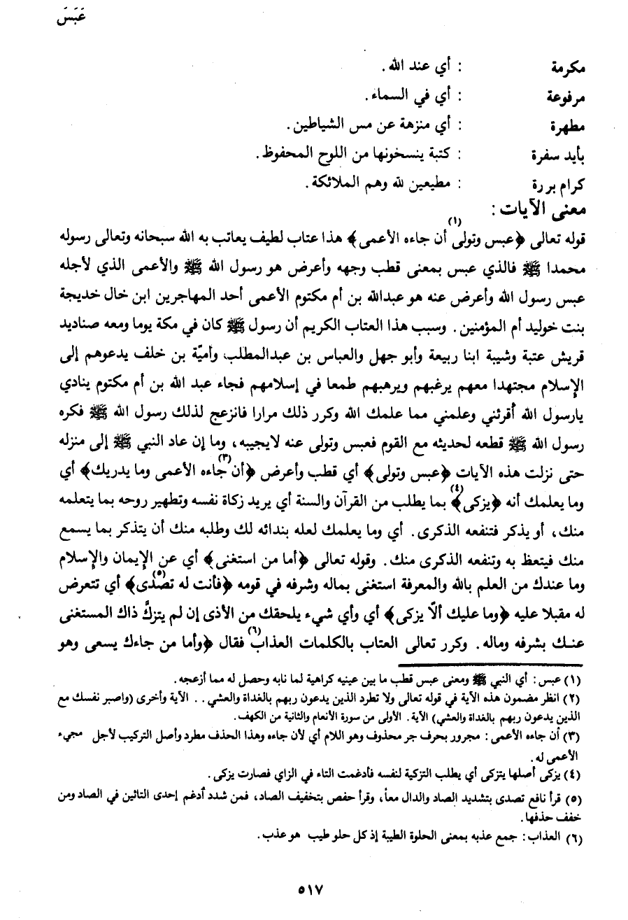 قوله تعالى {عَبَسَ وَتَوَلَّى1 أَنْ جَاءَهُ الْأَعْمَى} هذا عتاب لطيف يعاتب به الله سبحانه وتعالى رسوله محمدا صَلَّى اللهُ عَلَيْهِ وَسَلَّمَ فالذي عبث بمعنى قطب وجهه وأعرض هو رسول الله صَلَّى اللهُ عَلَيْهِ وَسَلَّمَ والأعمى الذي لأجله عبس رسول الله وأعرض عنه هو عبد الله بن أم مكتوم الأعمى أحد المهاجرين ابن خال خديجة بنت خويلد أم المؤمنين. وسبب هذا العتاب الكريم أن الرسول صَلَّى اللهُ عَلَيْهِ وَسَلَّمَ كان في مكة يوما ومعه صناديد قريش عتبة وشيبة ابنا ربيعة وأبو جهل والعباس بن عبد المطلب وأمية بن خلف يدعوهم إلى الإسلام مجتهدا معهم يرغبهم ويرهبهم طمعا في إسلامهم فجاء عبد الله بن أم مكتوم ينادي يا رسول الله أقرئني وعلمني مما علمك الله وكرر ذلك مرارا فانزعج لذلك رسول الله صَلَّى اللهُ عَلَيْهِ وَسَلَّمَ فكره رسول الله صَلَّى اللهُ عَلَيْهِ وَسَلَّمَ قطعه لحديثه مع القوم فعبس وتولى عنه لا يجيبه، وما إن عاد النبي صَلَّى اللهُ عَلَيْهِ وَسَلَّمَ إلى منزله حتى نزلت هذه الآيات {عَبَسَ وَتَوَلَّى} 2 أي قطب وأعرض {أَنْ جَاءَهُ3 الْأَعْمَى وَمَا يُدْرِيكَ} أي وما يعلمك أنه {يَزَّكَّى4} بما يطلب من القرآن والسنة أي يريد زكاة نفسه وتطهير روحه بما يتعلمه منك، أو يذكر فتنفعه الذكرى. أي وما يعلمك لعله بندائه لك وطلبه منك أن يتذكر بما يسمع منك فيتعظ به وتنفعه الذكرى منك. وقوله تعالى {أَمَّا مَنِ اسْتَغْنَى} أي عن الإيمان والإسلام وما عندك من العلم بالله والمعرفة استغنى بماله وشرفه في قومه {فَأَنْتَ لَهُ تَصَدَّى5} أي تتعرض له مقبلا عليه {وَمَا عَلَيْكَ أَلاَّ يَزَّكَّى} أي وأي شيء يلحقك من الأذى إن لم يتزك ذاك المستغنى عنك بشرفه وماله. وكرر تعالى العتاب بالكلمات العذاب6 {وَأَمَّا مَنْ جَاءَكَ يَسْعَى وَهُوَ