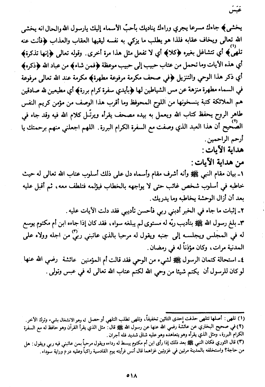 يَخْشَى} جاءك مسرعا يجري وراءك يناديك بأحب الأسماء إليك يا رسول الله والحال انه يخشى الله تعالى ويخاف عقابه فلذا هو يطلب ما يزكي به نفسه ليقيها العقاب والعذاب {فَأَنْتَ عَنْهُ تَلَهَّى1} أي تتشاغل بغيره {كَلاَّ} أي لا تفعل مثل هذا مرة أخرى. وقوله تعالى {إِنَّهَا تَذْكِرَةٌ} أي هذه الآيات وما تحمل من عتاب حبيب إلى حبيب موعظة {فَمَنْ شَاءَ} من عباد الله {ذَكَرَهُ} أي ذكر الوحي والتنزيل {فِي صُحُفٍ مُكَرَّمَةٍ مَرْفُوعَةٍ مُطَهَّرَةٍ} مكرمة عند الله تعالى مرفوعة في السماء مطهرة منزهة عن مس الشياطين لها {بِأَيْدِي سَفَرَةٍ كِرَامٍ بَرَرَةٍ} أي مطيعين لله صادقين هم الملائكة كتبة ينسخونها من اللوح المحفوظ وما أقرب هذا الوصف من مؤمن كريم النفس طاهر الروح يحفظ كتاب الله ويعمل به بيده مصحف يقرأه ويرتل كلام الله فيه وقد جاء في الصحيح2 أن هذا العبد الذي وصفت مع السفرة الكرام البررة. اللهم اجعلني منهم برحمتك يا أرحم الراحمين.