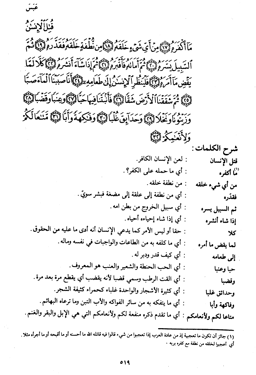 قُتِلَ الْإنْسَانُ مَا أَكْفَرَهُ (17) مِنْ أَيِّ شَيْءٍ خَلَقَهُ (18) مِنْ نُطْفَةٍ خَلَقَهُ فَقَدَّرَهُ (19) ثُمَّ السَّبِيلَ يَسَّرَهُ (20) ثُمَّ أَمَاتَهُ فَأَقْبَرَهُ (21) ثُمَّ إِذَا شَاءَ أَنْشَرَهُ (22) كَلاَّ لَمَّا يَقْضِ مَا أَمَرَهُ (23) فَلْيَنْظُرِ الْإنْسَانُ إِلَى طَعَامِهِ (24) أَنَّا صَبَبْنَا الْمَاءَ صَبّاً (25) ثُمَّ شَقَقْنَا الْأَرْضَ شَقّا (26) فَأَنْبَتْنَا فِيهَا حَبّاً (27) وَعِنَباً وَقَضْباً (28) وَزَيْتُوناً وَنَخْلاً (29) وَحَدَائِقَ غُلْباً (30) وَفَاكِهَةً وَأَبّاً (31) مَتَاعاً لَكُمْ وَلِأَنْعَامِكُمْ (32)