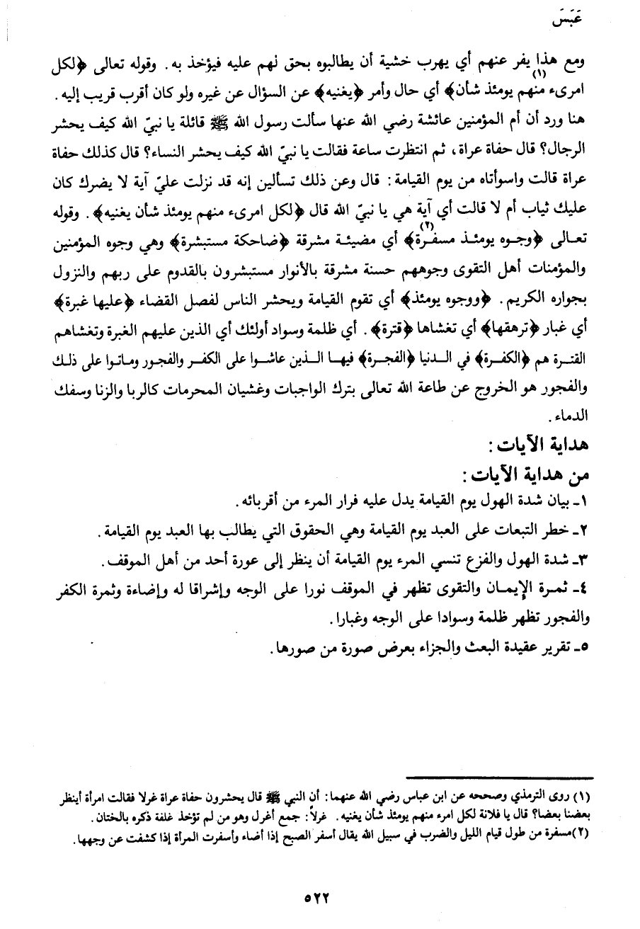 1 روى الترمذي وصححه عن ابن عباس رضي الله عنهما: أن النبي صَلَّى اللهُ عَلَيْهِ وَسَلَّمَ قال يحشرون حفاة عراة غرلا فقالت امرأة أينظر بعضنا بعضا؟ قال يافلانة لكل امرء منهم يومئذ شأن يغنيه. غرلاً: جمع أغرل وهو من لم تؤخذ غلفة ذكره بالختان.