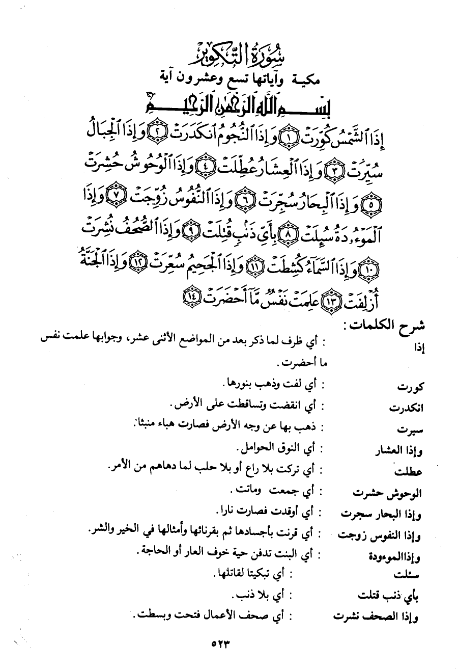 إِذَا الشَّمْسُ كُوِّرَتْ (1) وَإِذَا النُّجُومُ انْكَدَرَتْ (2) وَإِذَا الْجِبَالُ سُيِّرَتْ (3) وَإِذَا الْعِشَارُ عُطِّلَتْ (4) وَإِذَا الْوُحُوشُ حُشِرَتْ (ا5) وَإِذَا الْبِحَارُ سُجِّرَتْ (6) وَإِذَا النُّفُوسُ زُوِّجَتْ (7) وَإِذَا الْمَوْءُودَةُ سُئِلَتْ (8) بِأَيِّ ذَنْبٍ قُتِلَتْ (9) وَإِذَا الصُّحُفُ نُشِرَتْ (10) وَإِذَا السَّمَاءُ كُشِطَتْ (11) وَإِذَا الْجَحِيمُ سُعِّرَتْ (12) وَإِذَا الْجَنَّةُ أُزْلِفَتْ (13) عَلِمَتْ نَفْسٌ مَا أَحْضَرَتْ (14)