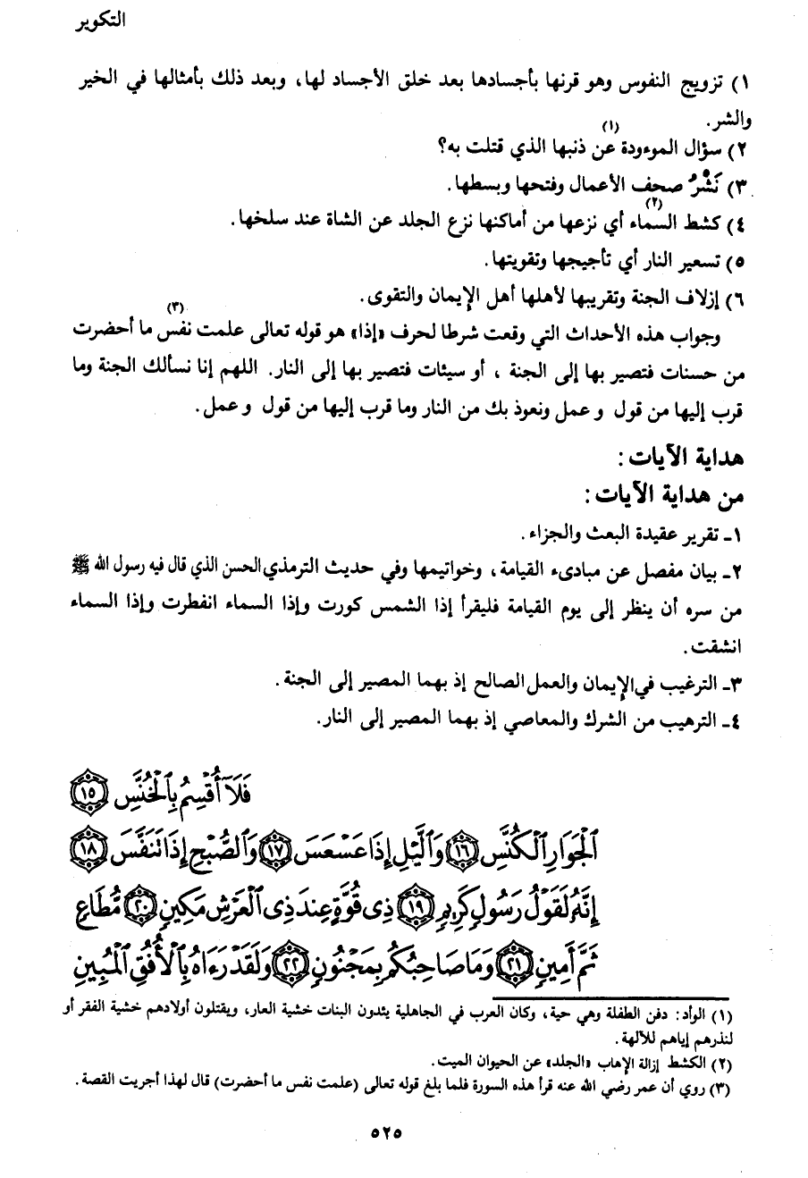 فَلا أُقْسِمُ بِالْخُنَّسِ (15) الْجَوَارِ الْكُنَّسِ (16) وَاللَّيْلِ إِذَا عَسْعَسَ (17) وَالصُّبْحِ إِذَا تَنَفَّسَ (18) إِنَّهُ لَقَوْلُ رَسُولٍ كَرِيمٍ (19) ذِي قُوَّةٍ عِنْدَ ذِي الْعَرْشِ مَكِينٍ (20) مُطَاعٍ ثَمَّ أَمِينٍ (21)) وَمَا صَاحِبُكُمْ بِمَجْنُونٍ (22) وَلَقَدْ رَآهُ بِالْأُفُقِ الْمُبِينِ