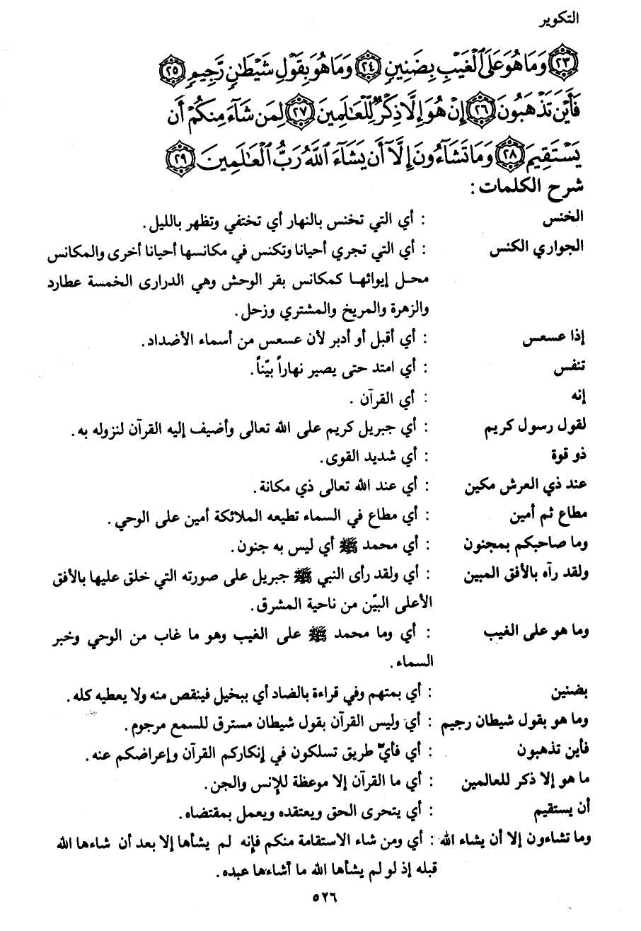 (23) وَمَا هُوَ عَلَى الْغَيْبِ بِضَنِينٍ (24) وَمَا هُوَ بِقَوْلِ شَيْطَانٍ رَجِيمٍ (25) فَأَيْنَ تَذْهَبُونَ (26) إِنْ هُوَ إِلَّا ذِكْرٌ لِلْعَالَمِينَ (27) لِمَنْ شَاءَ مِنْكُمْ أَنْ يَسْتَقِيمَ (28) وَمَا تَشَاءُونَ إِلَّا أَنْ يَشَاءَ اللهُ رَبُّ الْعَالَمِينَ (29)