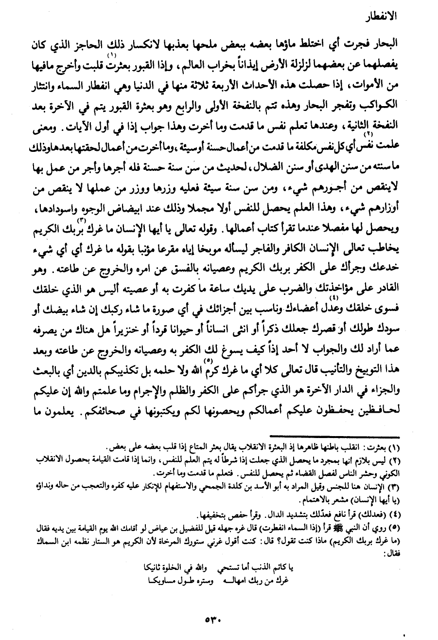 5 روي أن النبي صَلَّى اللهُ عَلَيْهِ وَسَلَّمَ قرأ (إذا السماء انفطرت) قال غره جهله قيل للفضيل بن عياض لو أقامك الله يوم القيامة بين يديه فقال (ما غرك بربك الكريم) ماذا كنت تقول؟ قال: كنت أقول غرني ستورك المرخاة لأن الكريم هو الستار نظمه ابن السماك فقال: