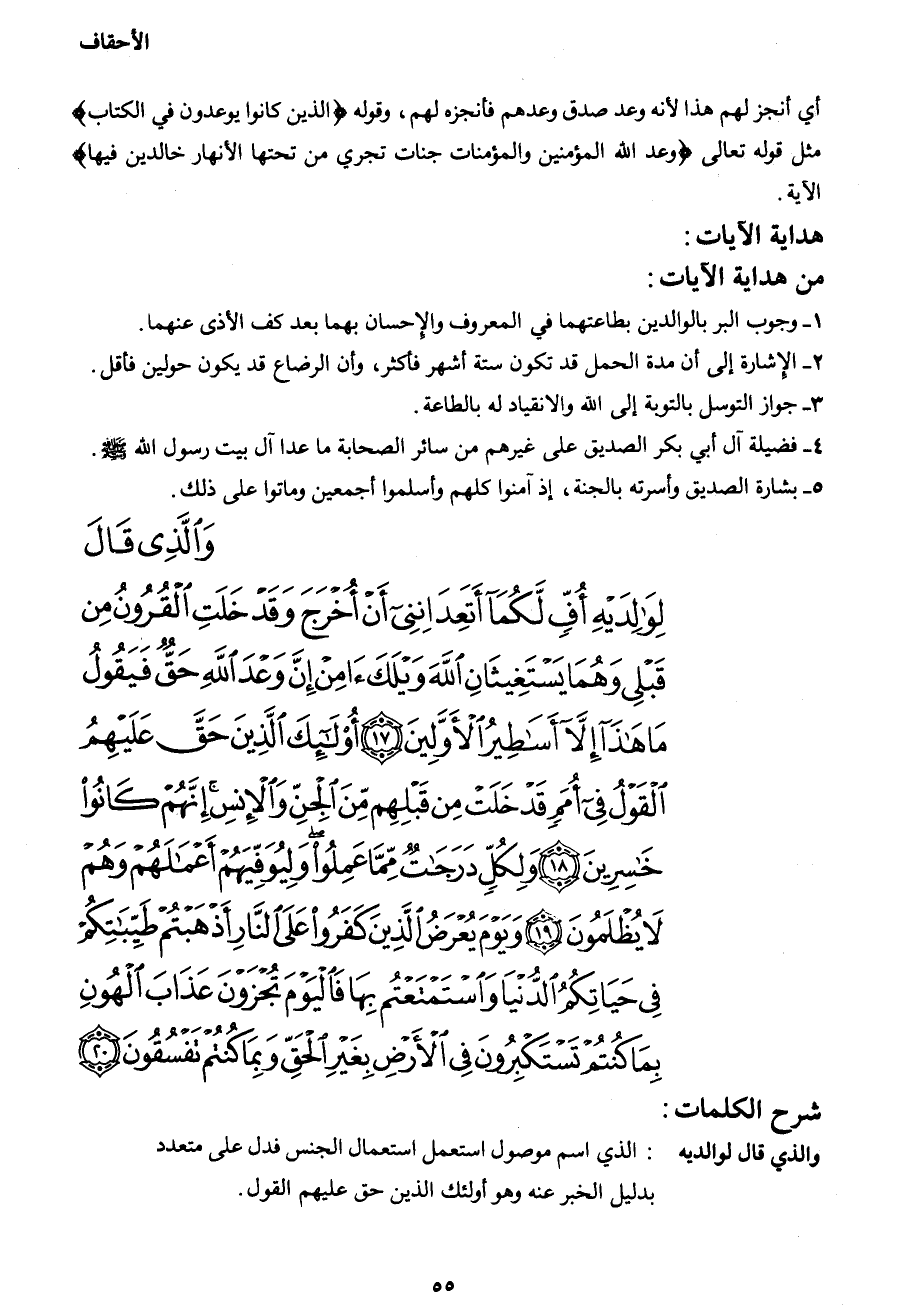 وَالَّذِي قَالَ لِوَالِدَيْهِ أُفٍّ لَكُمَا أَتَعِدَانِنِي أَنْ أُخْرَجَ وَقَدْ خَلَتِ الْقُرُونُ مِنْ قَبْلِي وَهُمَا يَسْتَغِيثَانِ اللهَ وَيْلَكَ آمِنْ إِنَّ وَعْدَ اللهِ حَقٌّ فَيَقُولُ مَا هَذَا إِلَّا أَسَاطِيرُ الْأَوَّلِينَ (17) أُولَئِكَ الَّذِينَ حَقَّ عَلَيْهِمُ الْقَوْلُ فِي أُمَمٍ قَدْ خَلَتْ مِنْ قَبْلِهِمْ مِنَ الْجِنِّ وَالْأِنْسِ إِنَّهُمْ كَانُوا خَاسِرِينَ (18) وَلِكُلٍّ دَرَجَاتٌ مِمَّا عَمِلُوا وَلِيُوَفِّيَهُمْ أَعْمَالَهُمْ وَهُمْ لا يُظْلَمُونَ (19) وَيَوْمَ يُعْرَضُ الَّذِينَ كَفَرُوا عَلَى النَّارِ أَذْهَبْتُمْ طَيِّبَاتِكُمْ فِي حَيَاتِكُمُ الدُّنْيَا وَاسْتَمْتَعْتُمْ بِهَا فَالْيَوْمَ تُجْزَوْنَ عَذَابَ الْهُونِ بِمَا كُنْتُمْ تَسْتَكْبِرُونَ فِي الْأَرْضِ بِغَيْرِ الْحَقِّ وَبِمَا كُنْتُمْ تَفْسُقُونَ (20)