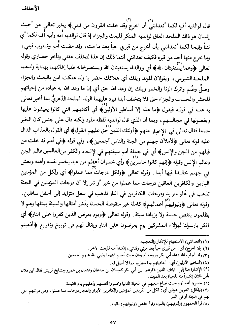 قَالَ لِوَالِدَيْهِ أُفٍّ لَكُمَا أَتَعِدَانِنِي1 أَنْ أُخْرَجَ2 وَقَدْ خَلَتِ الْقُرُونُ مِنْ قَبْلِي} يخبر الله تعالى عن أخبث إنسان هو ذاك الملحد العاق لوالديه المنكر للبعث والجزاء إذ قال لوالديه أمه وأبيه أف لكما أي نتناً وقبحا لكما أتعدانني بأن أخرج من قبري حياً بعد ما مت، وقد مضت أمم وشعوب قبلي، وما خرج منها أحد من قبره فكيف تعدانني أنتما ذلك إن هذا لتخلف عقلي وتأخر حضاري وقوله تعالى {وَهُمَا 3يَسْتَغِيثَانِ اللهَ} أي ووالداه يستغيثان الله ويستصرخانه طلبا إغاثتهما بهداية ولدهما الملحد الشيوعي، ويقولان للولد ويلك أي هلاكك حضر يا ولد هلكت آمن بالبعث والجزاء وصل وصم واترك الزنا والخمر ويلك إن وعد الله حق أي إن ما وعد الله به عباده من إحيائهم للحشر والحساب والجزاء حق فلا يتخلف أبدا فيرد عليهما الولد الملحد الدهري ابما أخبر تعالى به عنه في قوله فيقول {مَا هَذَا إِلَّا أَسَاطِيرُ الْأَوَّلِينَ4} أي أكاذيبهم التي كانوا يعيشون عليها ويقصونها في مجالسهم، وبما أن الذي قال لوالديه لفظه مفرد ولكنه دال على جنس كان الخبر جمعا فقال تعالى في الإخبار عنهم {أُولَئِكَ الَّذِينَ5 حَقَّ عَلَيْهِمُ الْقَوْلُ} أي القول بالعذاب الدال عليه قوله تعالى {لأمْلَأَنَّ جَهَنَّمَ مِنَ الْجِنَّةِ وَالنَّاسِ أَجْمَعِينَ} ، وفي قوله {فِي أُمَمٍ قَدْ خَلَتْ مِنْ قَبْلِهِمْ مِنَ الْجِنِّ وَالْأِنْسِ} أي في جملة أمم سبقتهم في الإلحاد والكفر من العالمين عالم الجن وعالم الإنس وقوله {إِنَّهُمْ كَانُوا خَاسِرِينَ6} وأي خسران أعظم من عبد يخسر نفسه وأهله ويعش في جهنم خالدا فيها أبدا. وقوله تعالى {وَلِكُلٍّ دَرَجَاتٌ7 مِمَّا عَمِلُوا} أي ولكل من المؤمنين البارين والكافرين العاقين درجات مما عملوا من خير أو شر إلا أن درجات المؤمنين في الجنة تذهب في علو متزايد ودرجات الكافرين في النار تذهب في سفل متزايد إلى أسفل سافلين. وقوله تعالى {وَلِيُوَفِّيَهُمْ8 أَعْمَالَهُمْ} كاملة غير منقوصة الحسنة بعشر أمثالها والسيئة بمثلها وهم لا يظلمون بنقص حسنة ولا بزايدة سيئة. وقوله تعالى {وَيَوْمَ يُعْرَضُ الَّذِينَ كَفَرُوا عَلَى النَّارِ} أي اذكر يا رسولنا لهؤلاء المشركين يوم يعرضون على النار ويقال لهم في توبيخ وتقريع {أَذْهَبْتُمْ